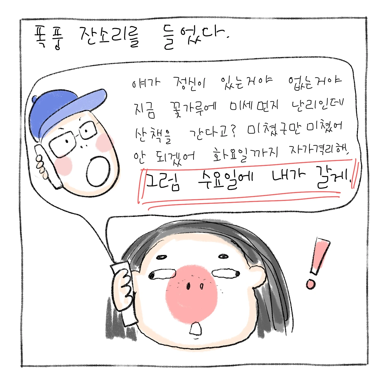 “얘가 정신이 있는 거야 없는 거야, 지금 꽃가루에 미세먼지 난리인데 산책을 간다고? 미쳤구만 미쳤어 ! 안 되겠어. 화요일까지 자가격리해. 그럼 수요일에 내가 갈게.“
