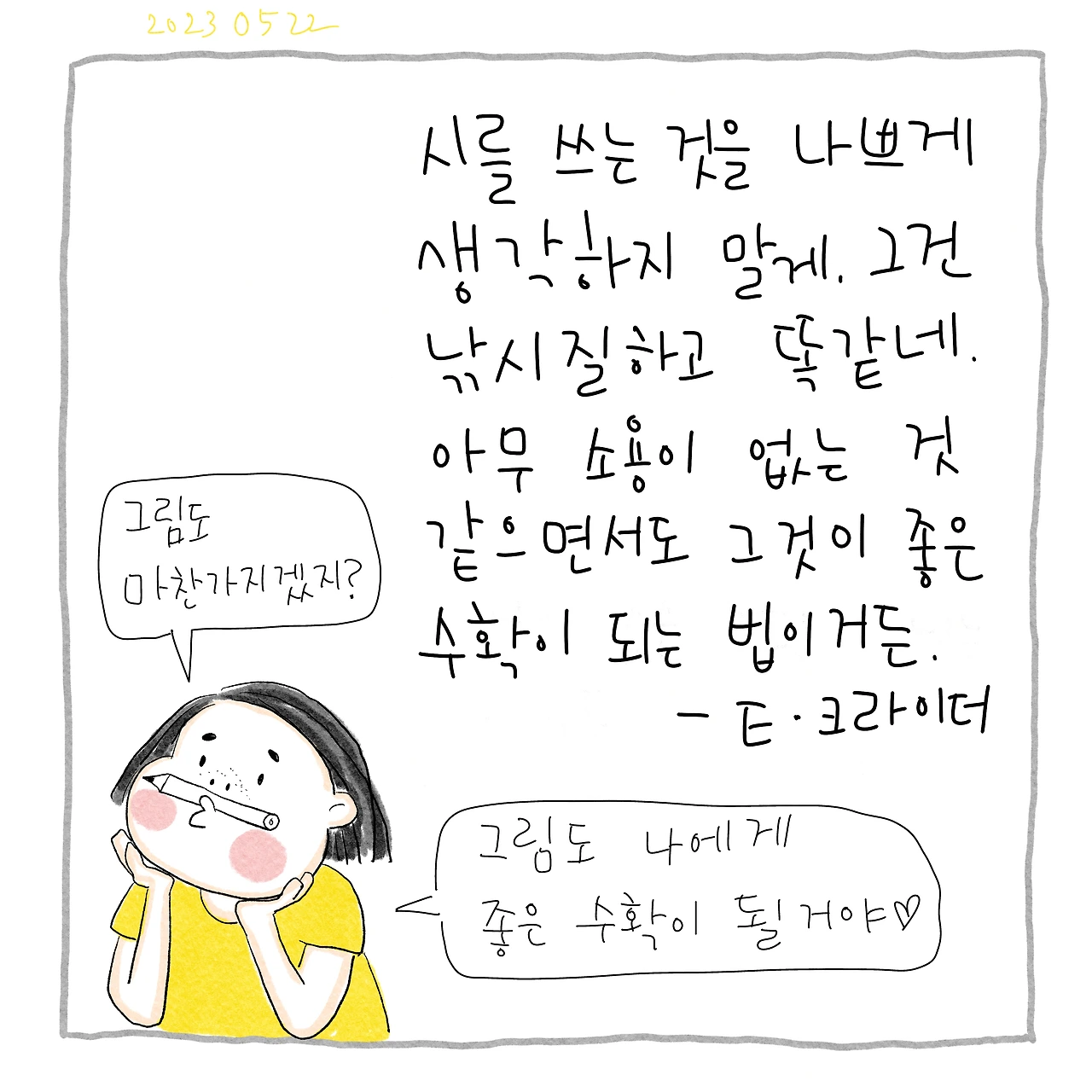 시를 쓰는 것을 나쁘게 생각하지 말게. 그건 낚시질하고 똑같네. 아무 소용이 없는 것 같으면서도 그것이 좋은 수확이 되는 법이거든. E.크라이더