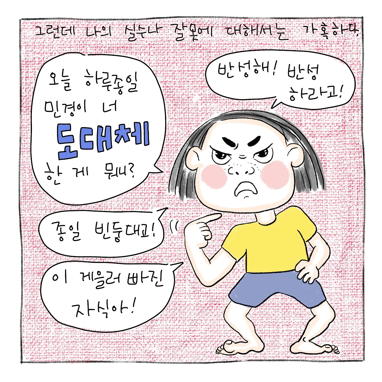 “오늘 하루종일 민경이 너 도대체 한 게 뭐니? 종일 빈둥대고! 이 게을러빠진 자식아! 반성해! “