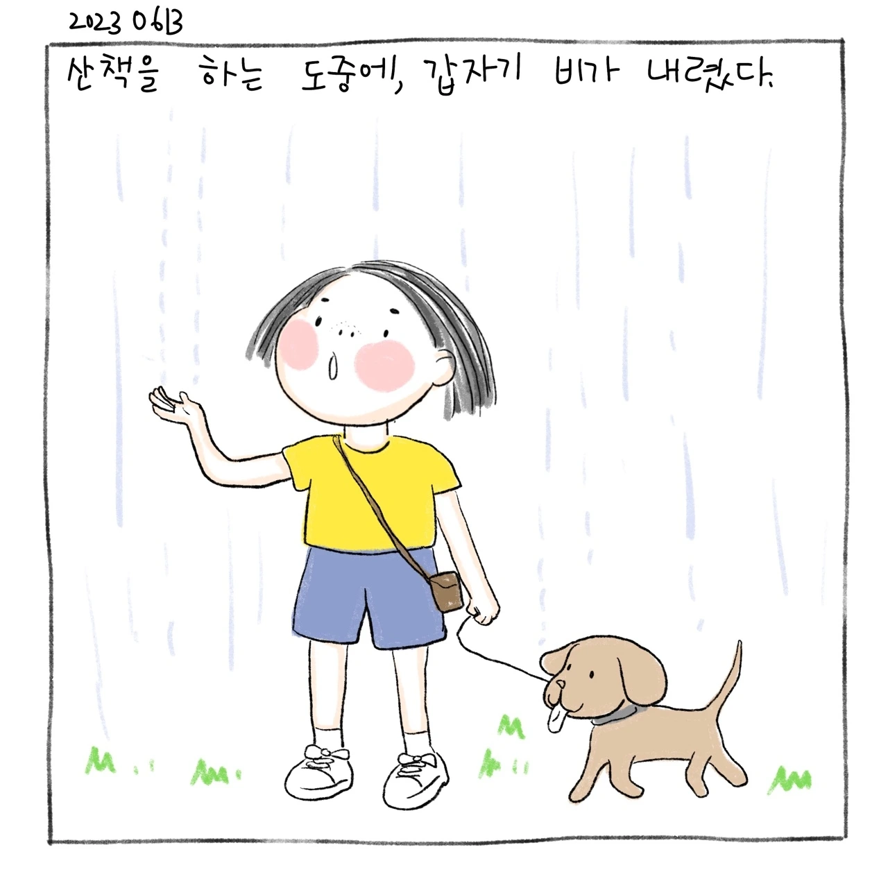 산책을 하는 도중에, 갑자기 비가 내렸다.