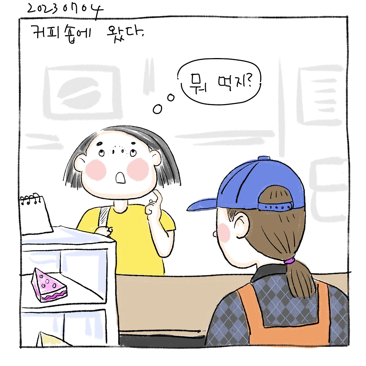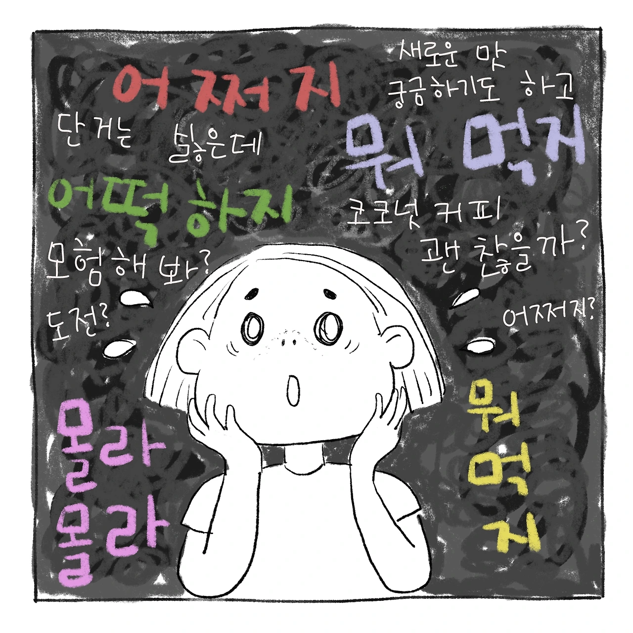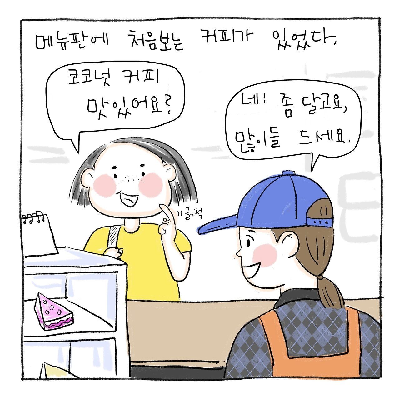 ‘어쩌지 뭐 먹지 어떡하지 코코넛 커피 괜찮을까? 단 거는 싫은데 모험해봐? 도전 ? “