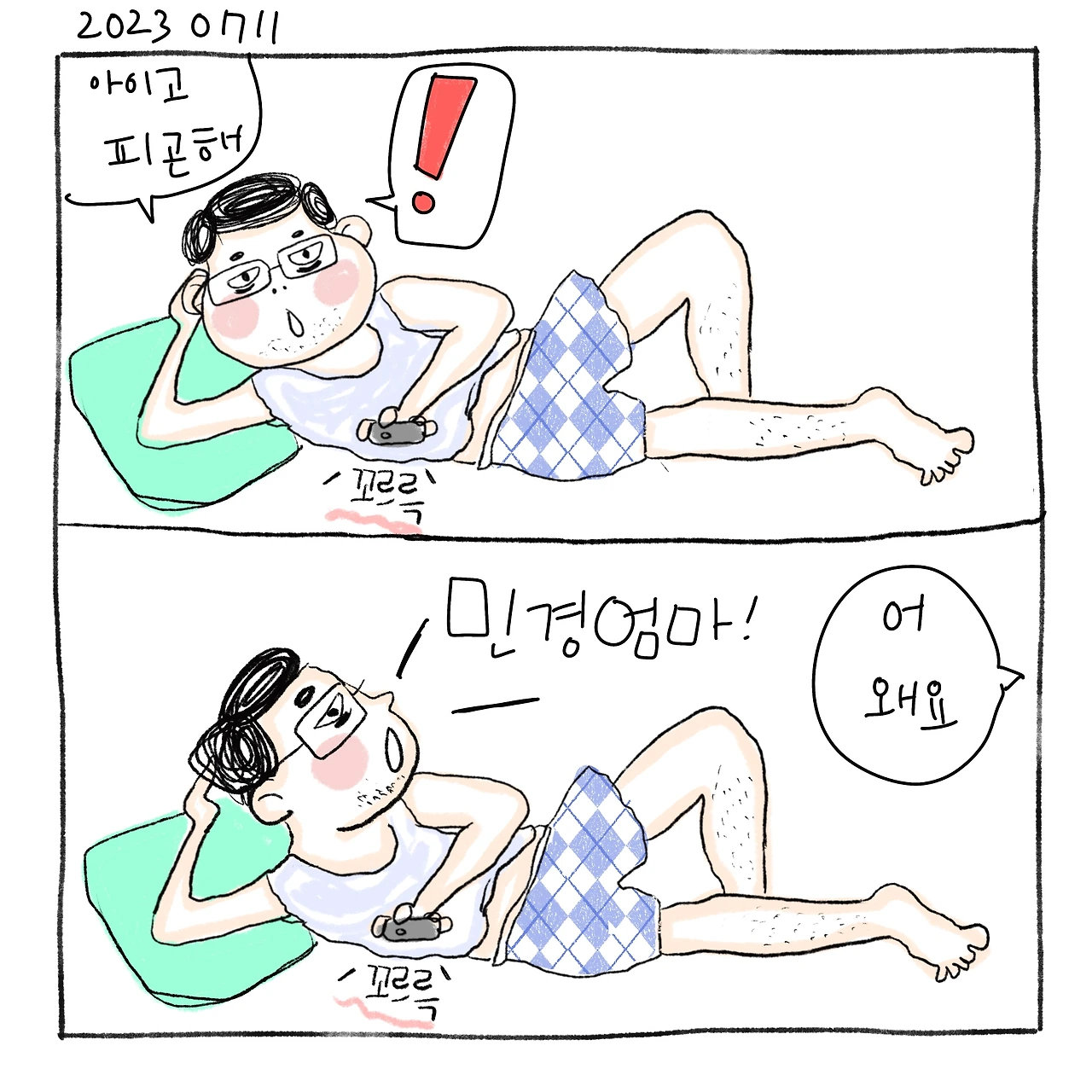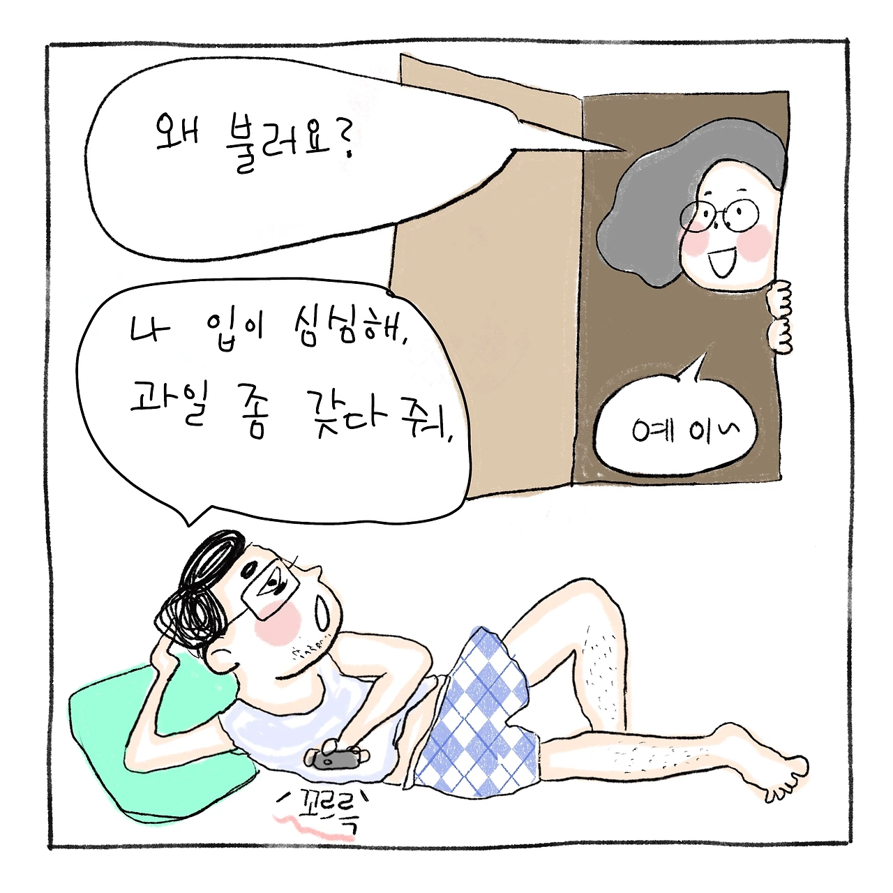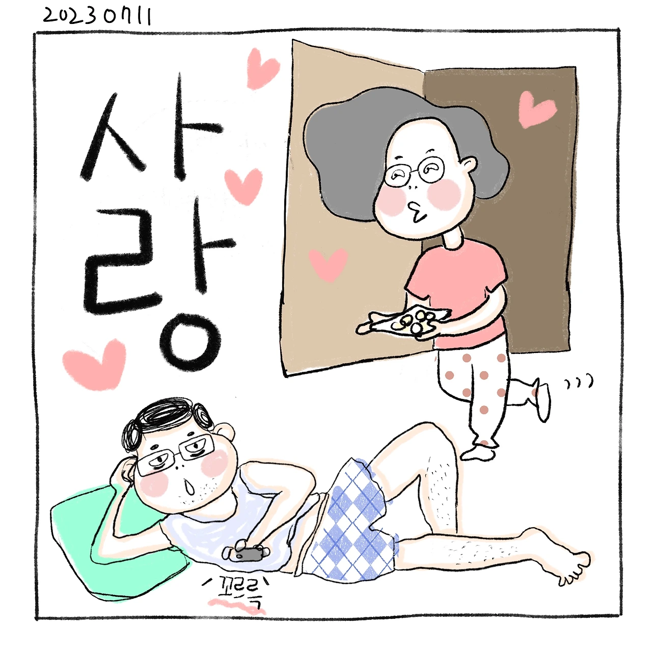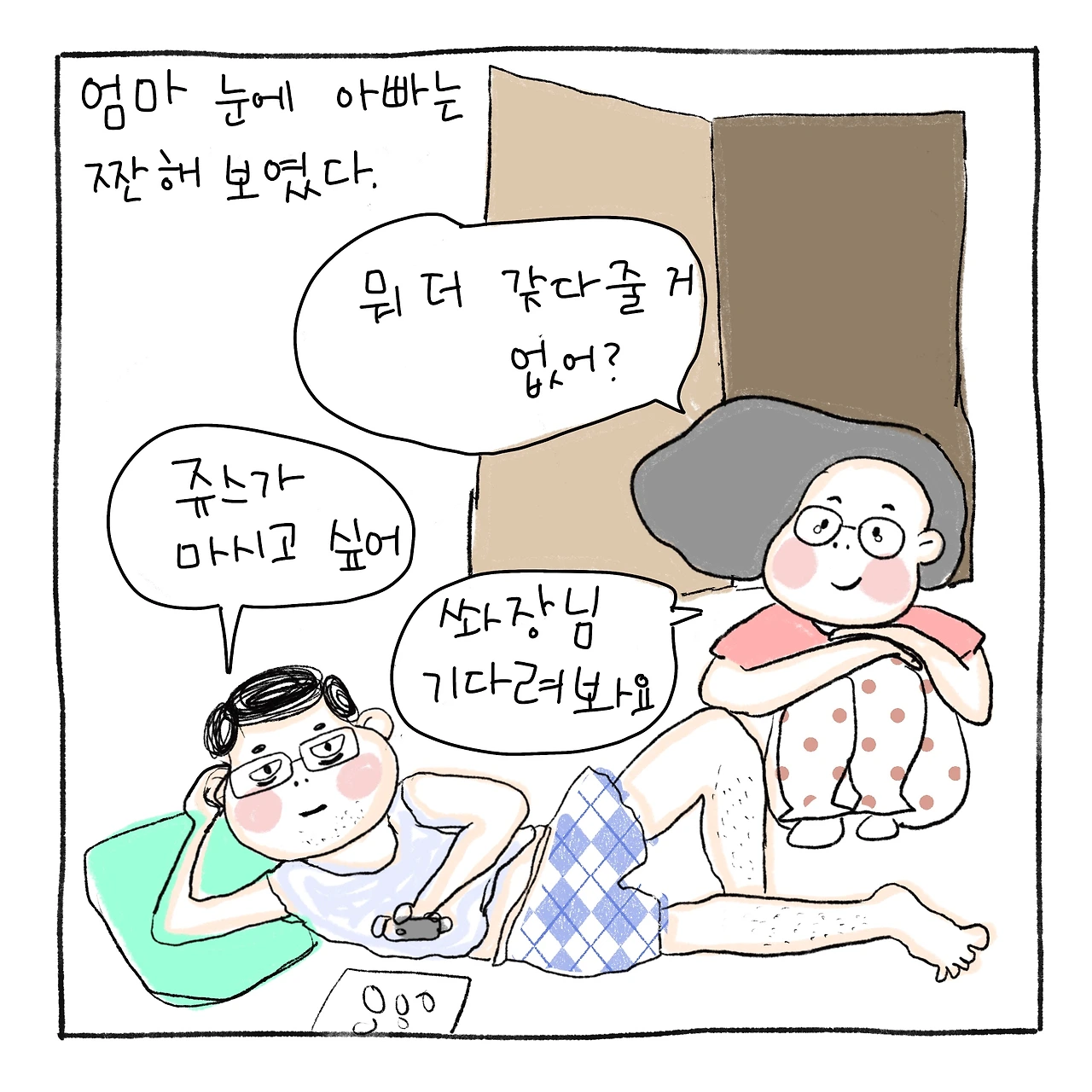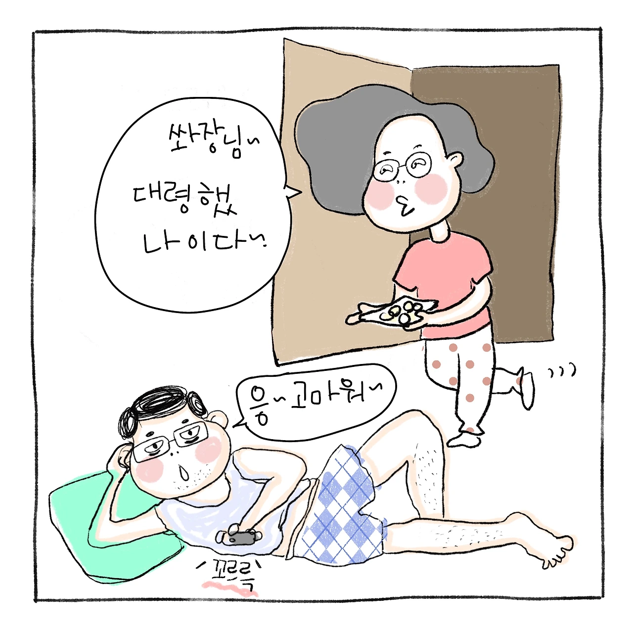 가끔씩 아부지와 어머니는 사장님 놀이를 하십니다. 아빠는 계속 시키시고 엄마는 자꾸 갖다 주십니다. 사장님 사장님 하시며 자꾸 심부름을 하시는데 옆에서 보기 참 재미있어요. 아빠는 듬뿍 사랑받는 느낌이고 엄마는 오구오구 하는 느낌입니다. 보기 좋아요.