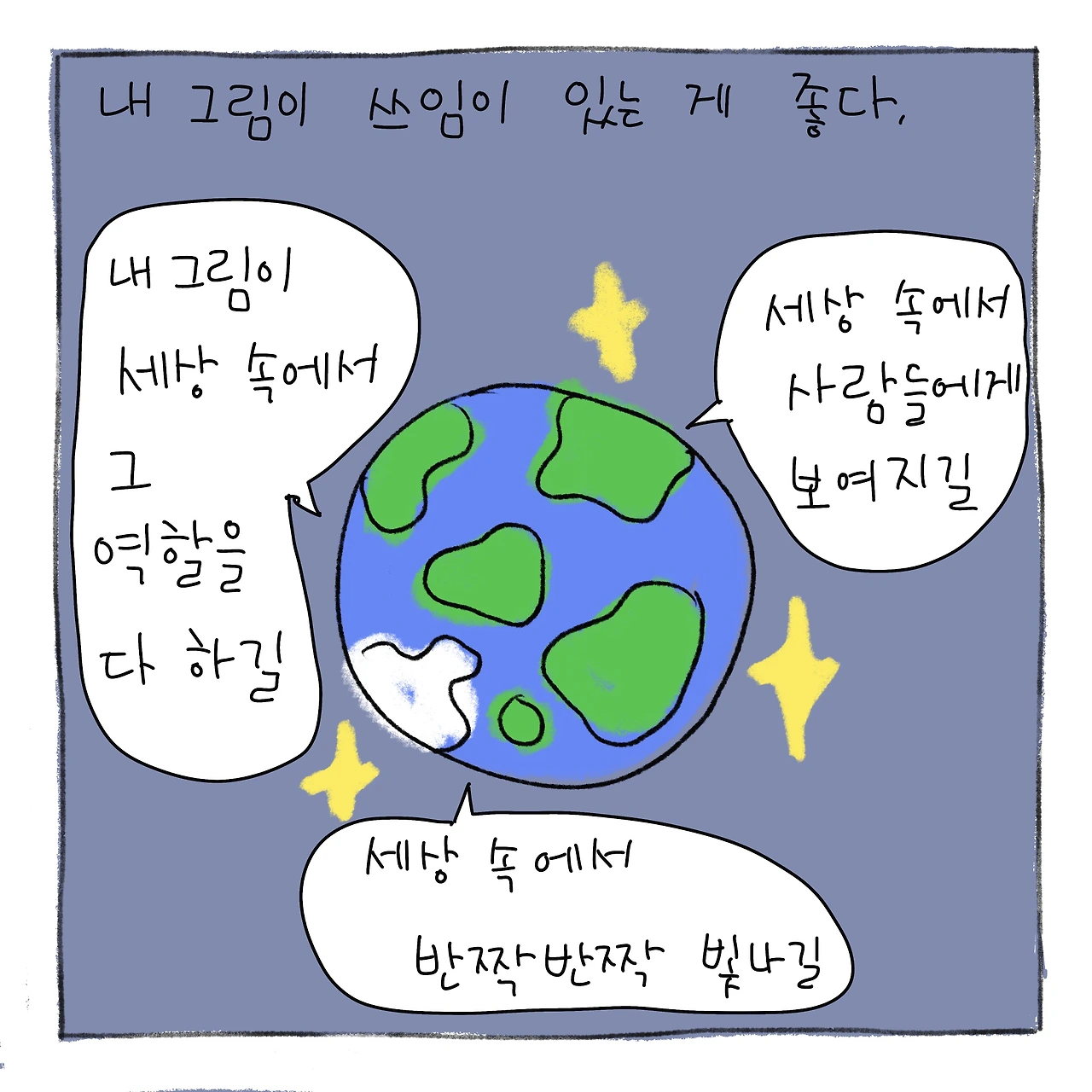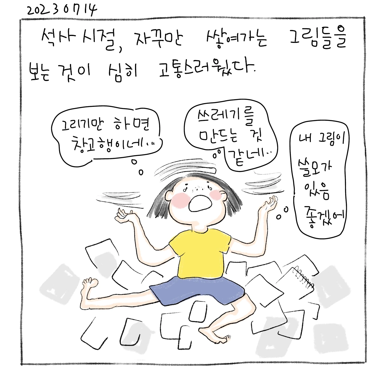 쓰임없이 쌓여가는 그림들이 꼭 쓰레기더미 같았다. 내가 도대체 왜 그림을 그리는 지 알 수 없었다. 단순한 자기만족? 감정의 배설? 나의 배설이 타인에게 악취로 다가가면 어쩌지?