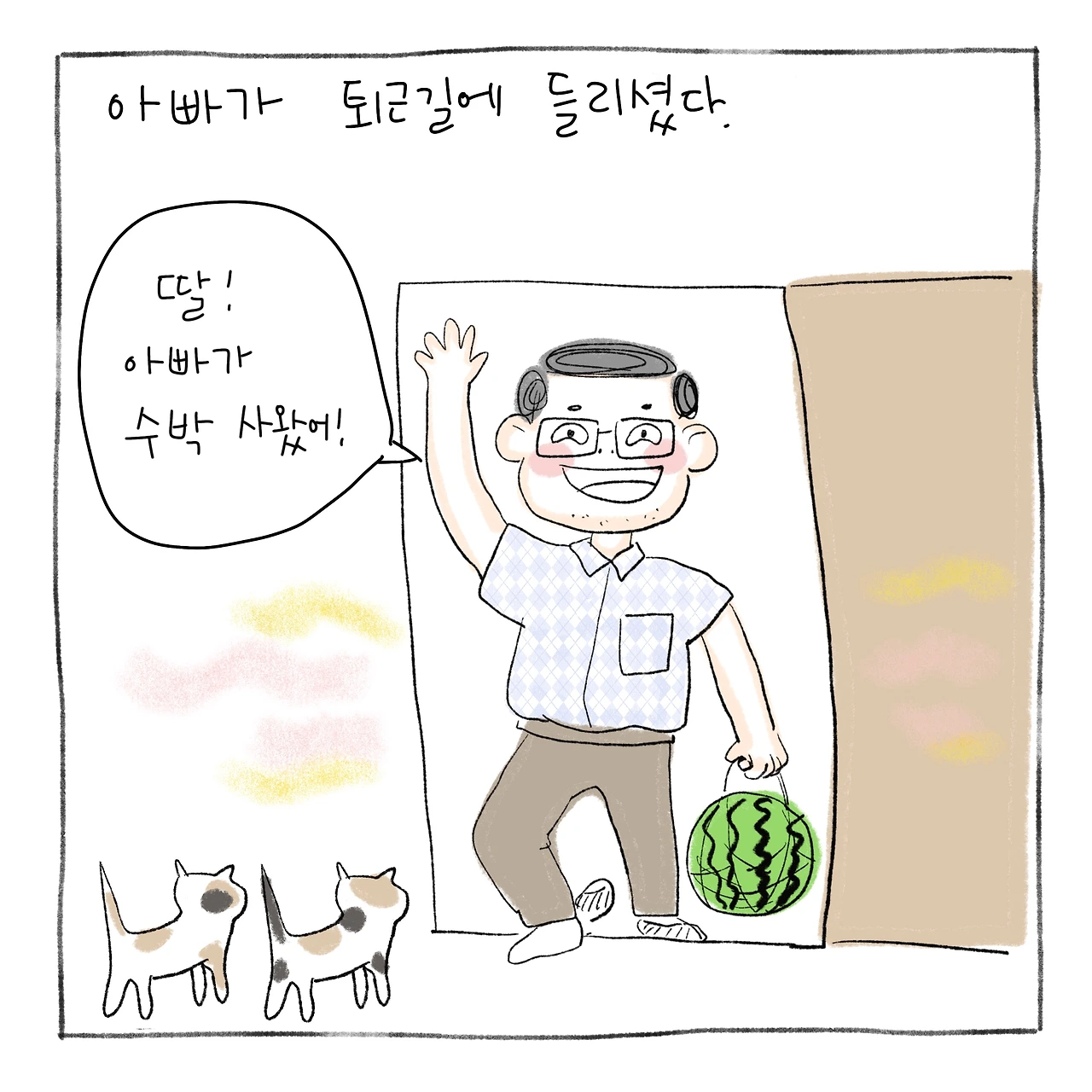 그런데 갑자기 아빠가 수박을 사들고 퇴근길에 들리셨어요.