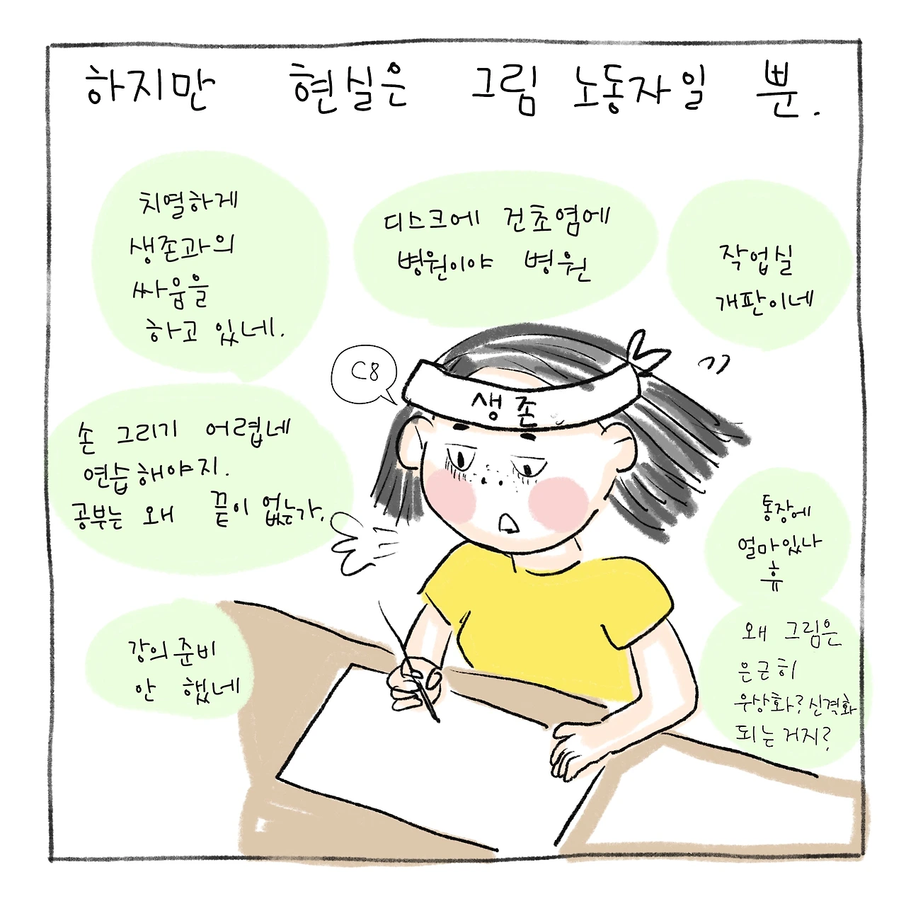 나는 한가한 예술놀음을 하고 있지 않아요. 나에게 그림이란 하나의 기술이자 살아갈 수 있는 수단에 가까운 것 같아요. 숨쉬듯이 쉬지않고 그림을 그리지만 향유보다 노동에 가까운 것 같아요. 디스크가 오고 건초염이 오고 고되고 힘들어요. 오늘은 왠지 더 지치네요…