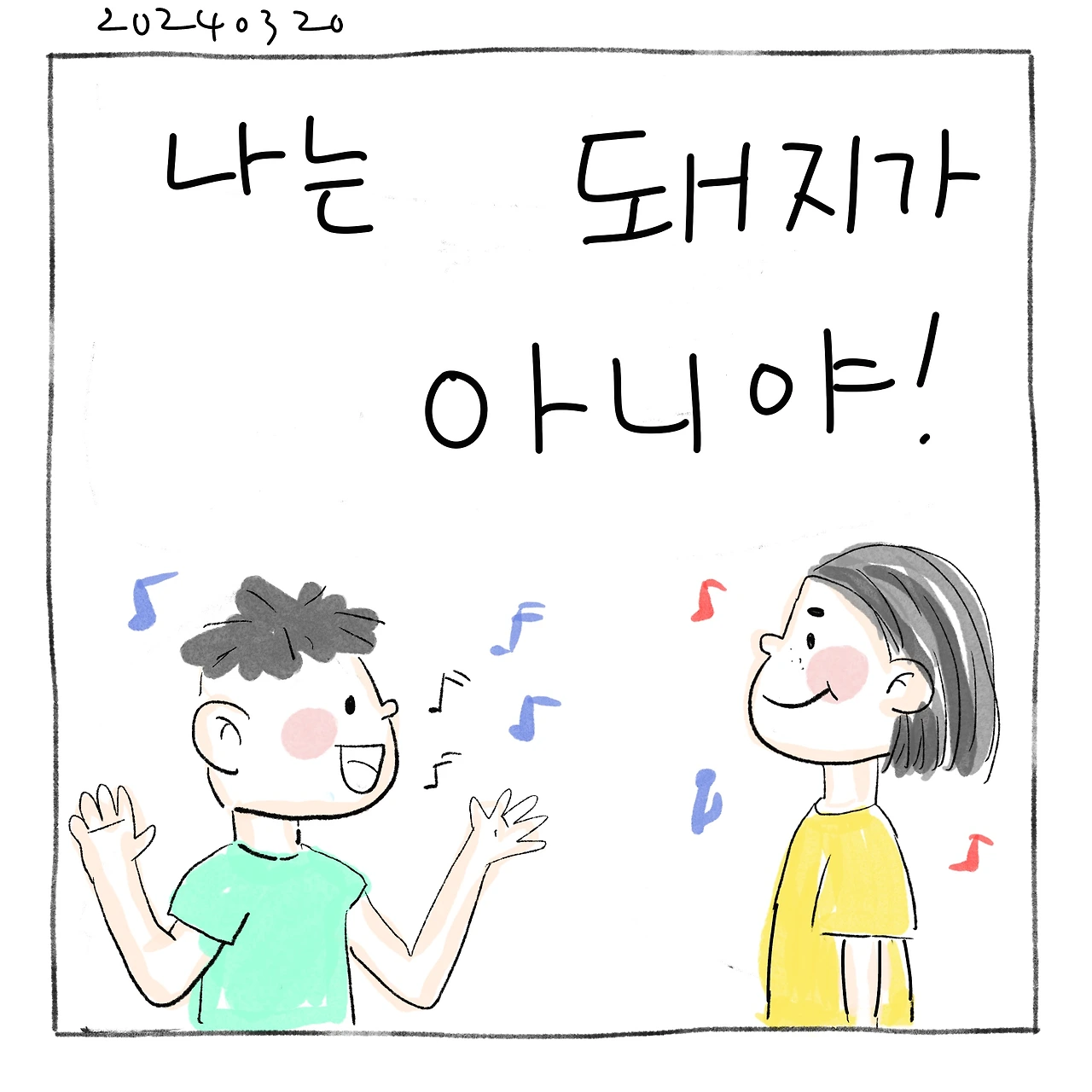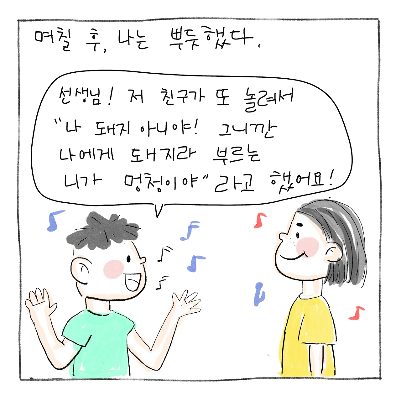 ”선생님!! 저 친구가 또 놀려서 ’나 돼지 아니야! 나를 돼지라 부르는 니가 멍청이야!‘했어요.