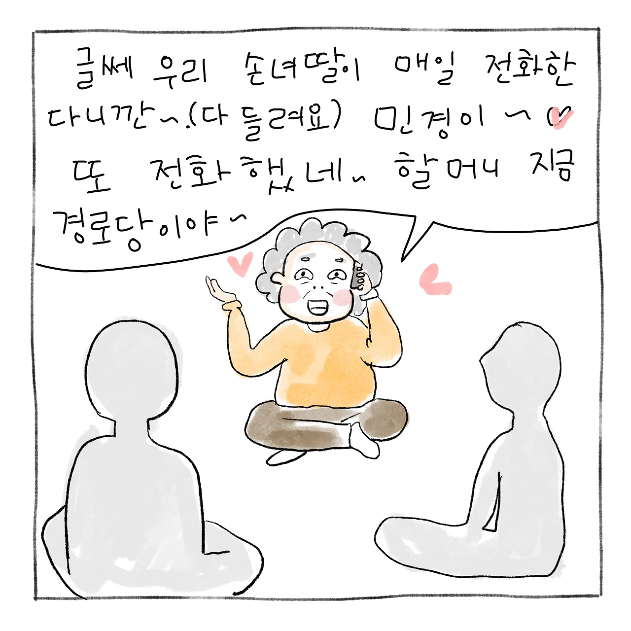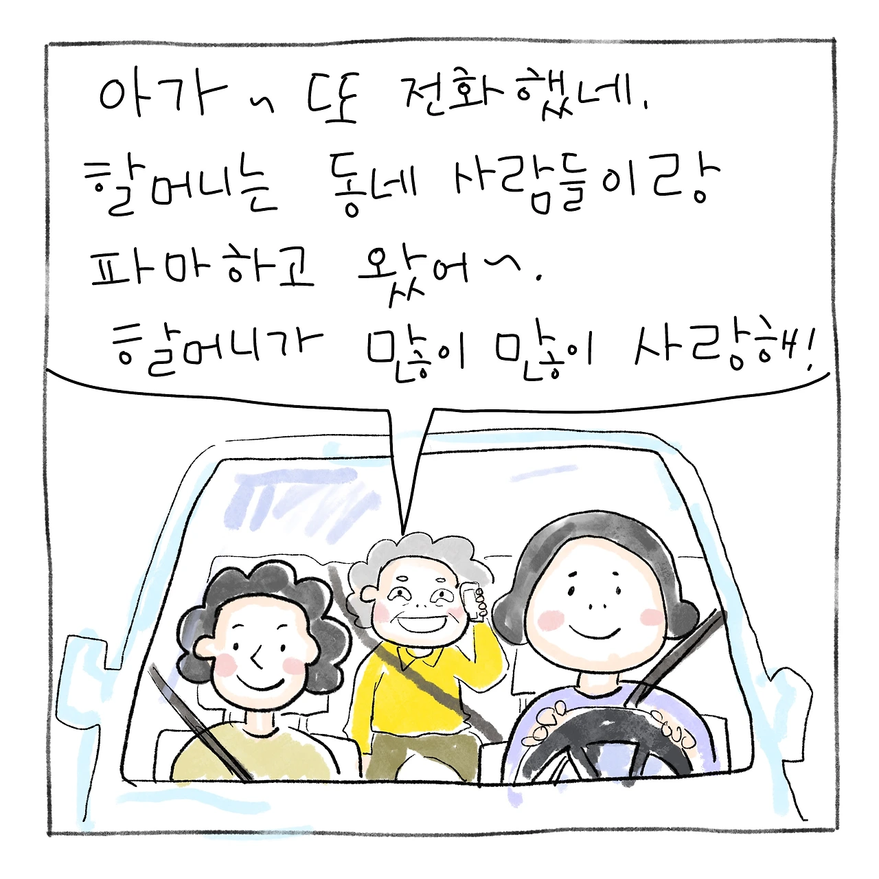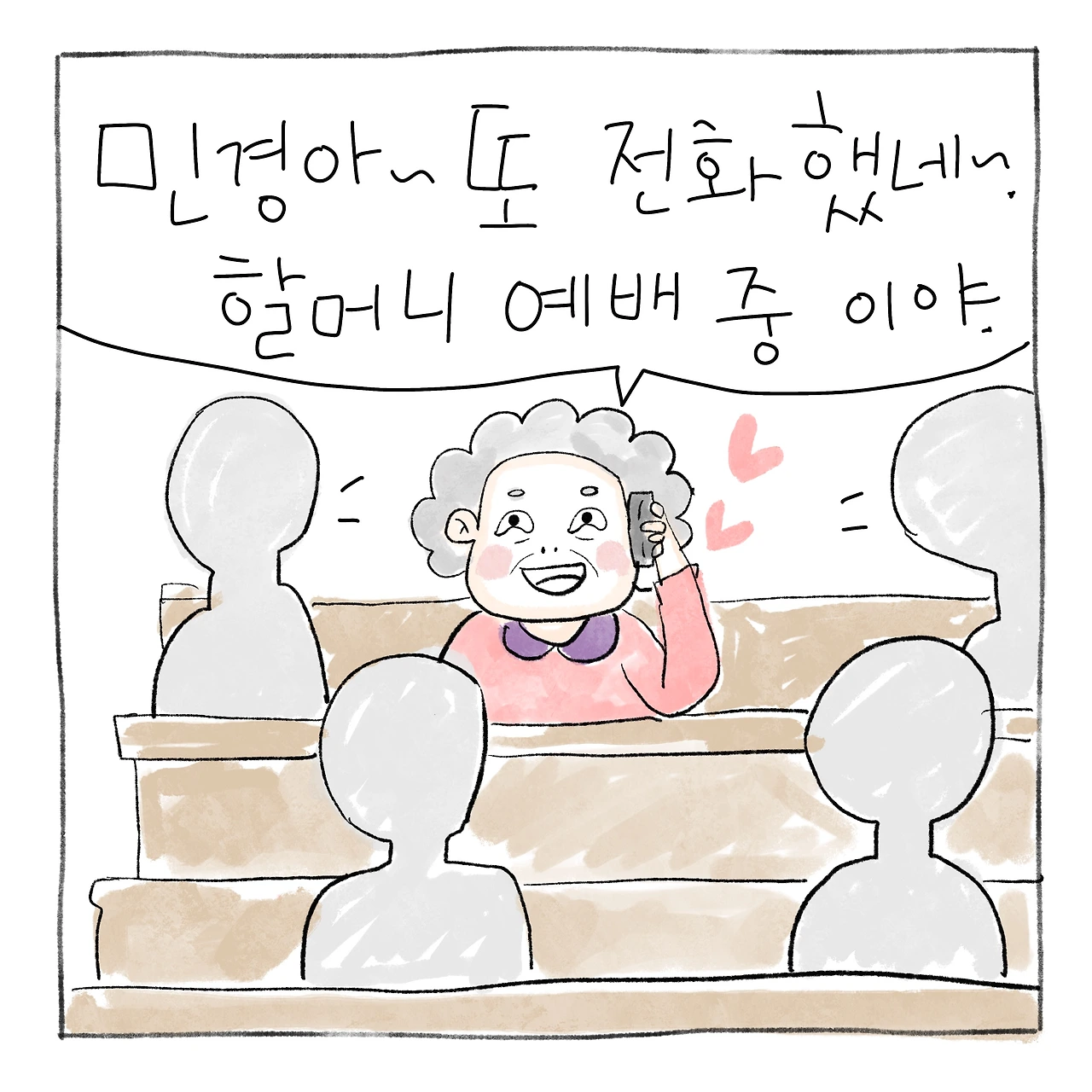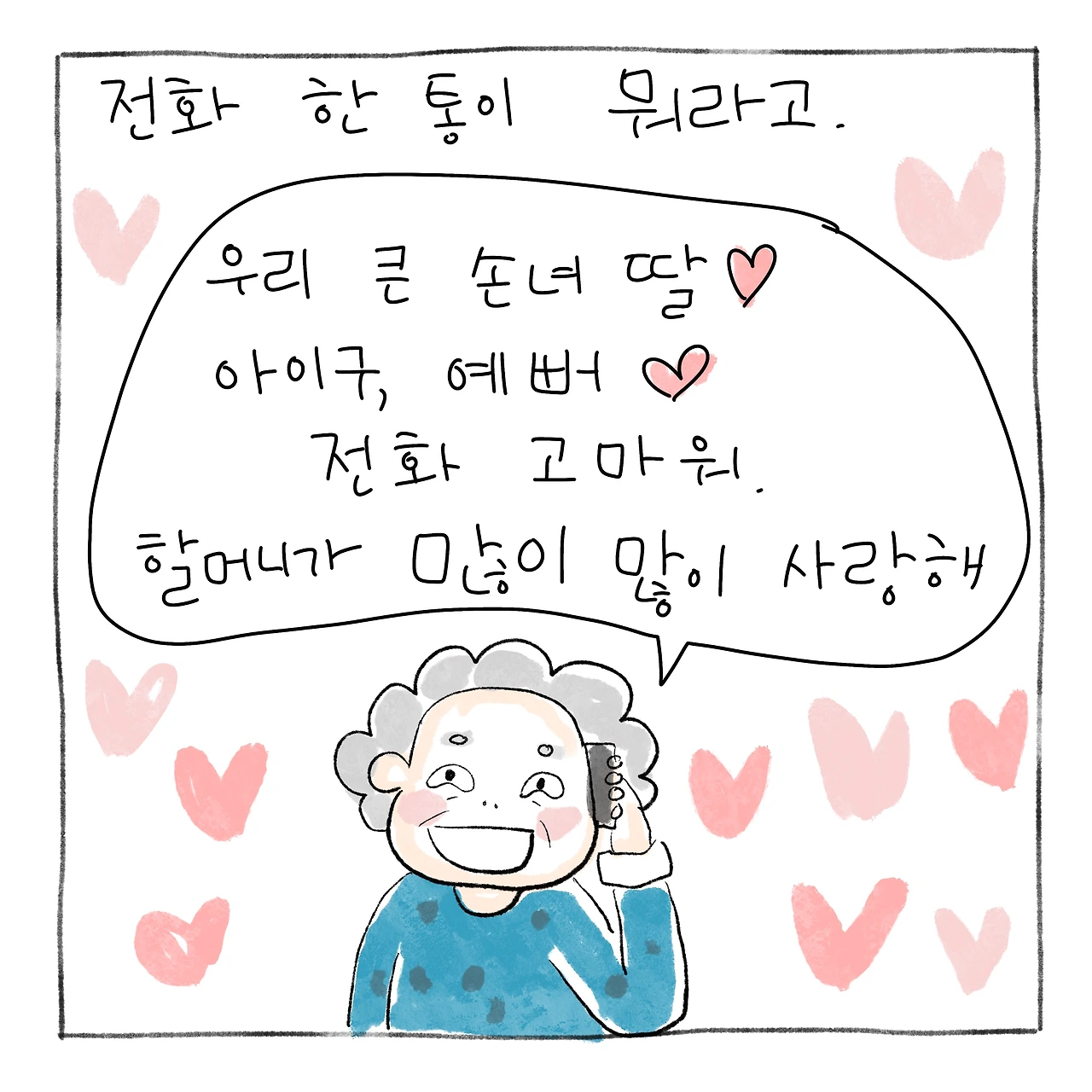 할머니와 나는 자주 전화한다. 매일 전화 하려 하지만 종종 빼 먹는다. 주로 아침 산책시간에 1분 정도 통화한다. 1분의 짧은 통화도 할머니는 좋으신가보다. 주변에 누가 있으면 알리려는 듯이 큰 소리로 “우리 손녀 전화 왔네“ 하신다. 빼 먹지 말아야지. 지금을 누려야지.