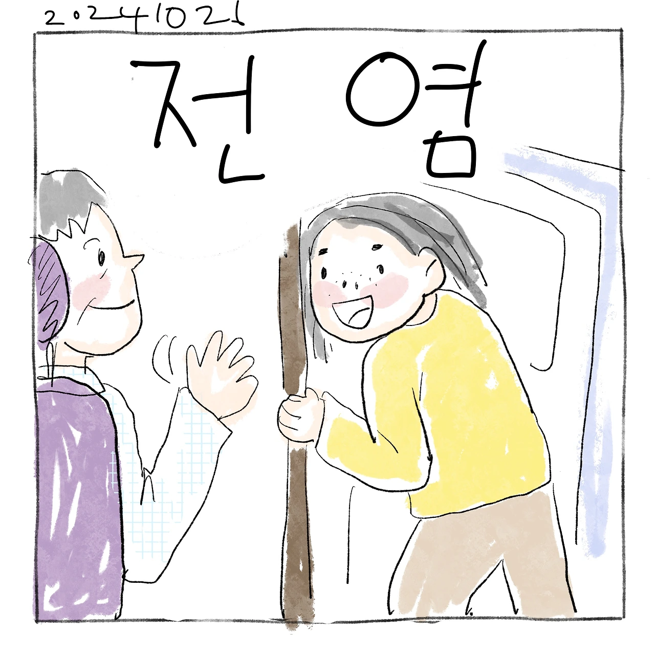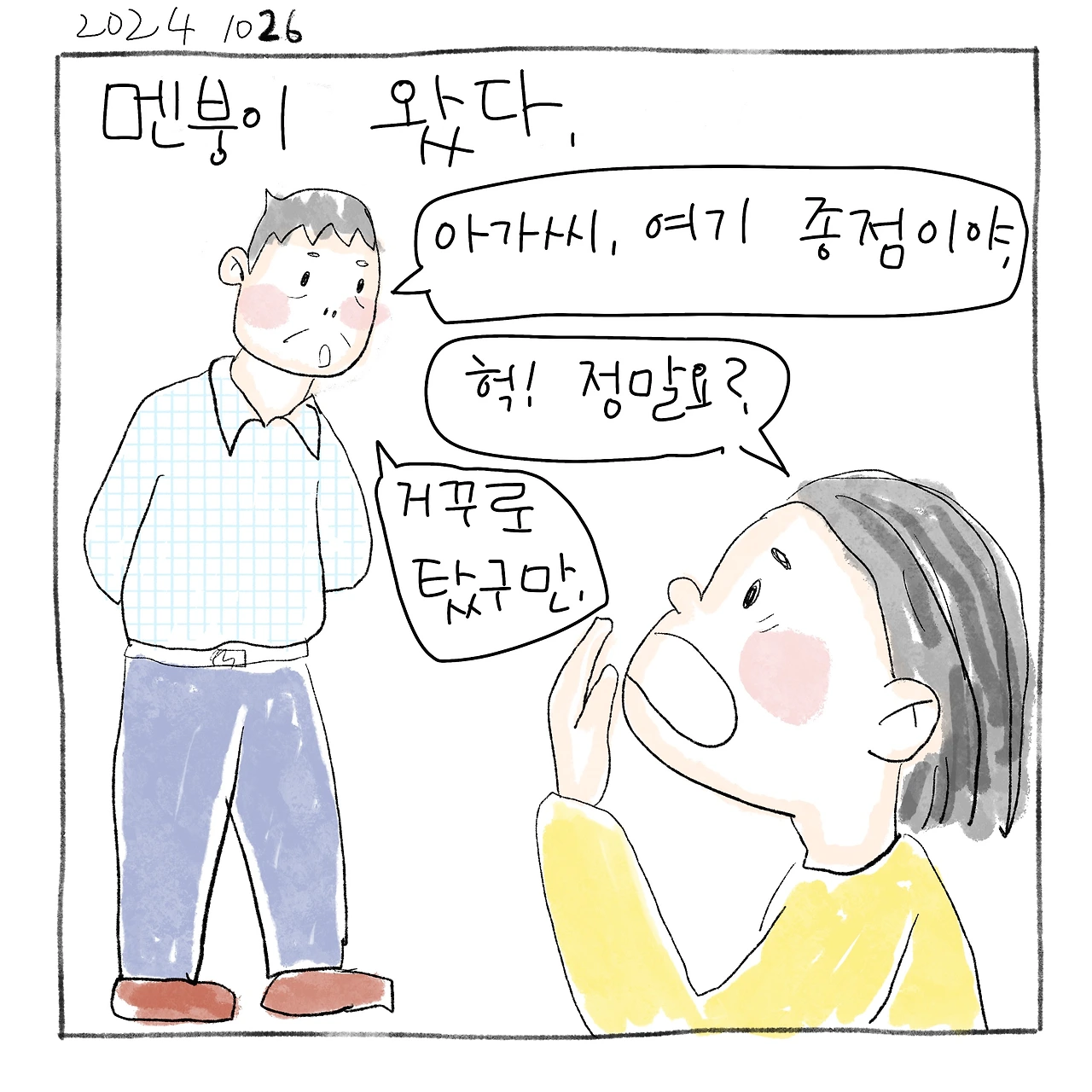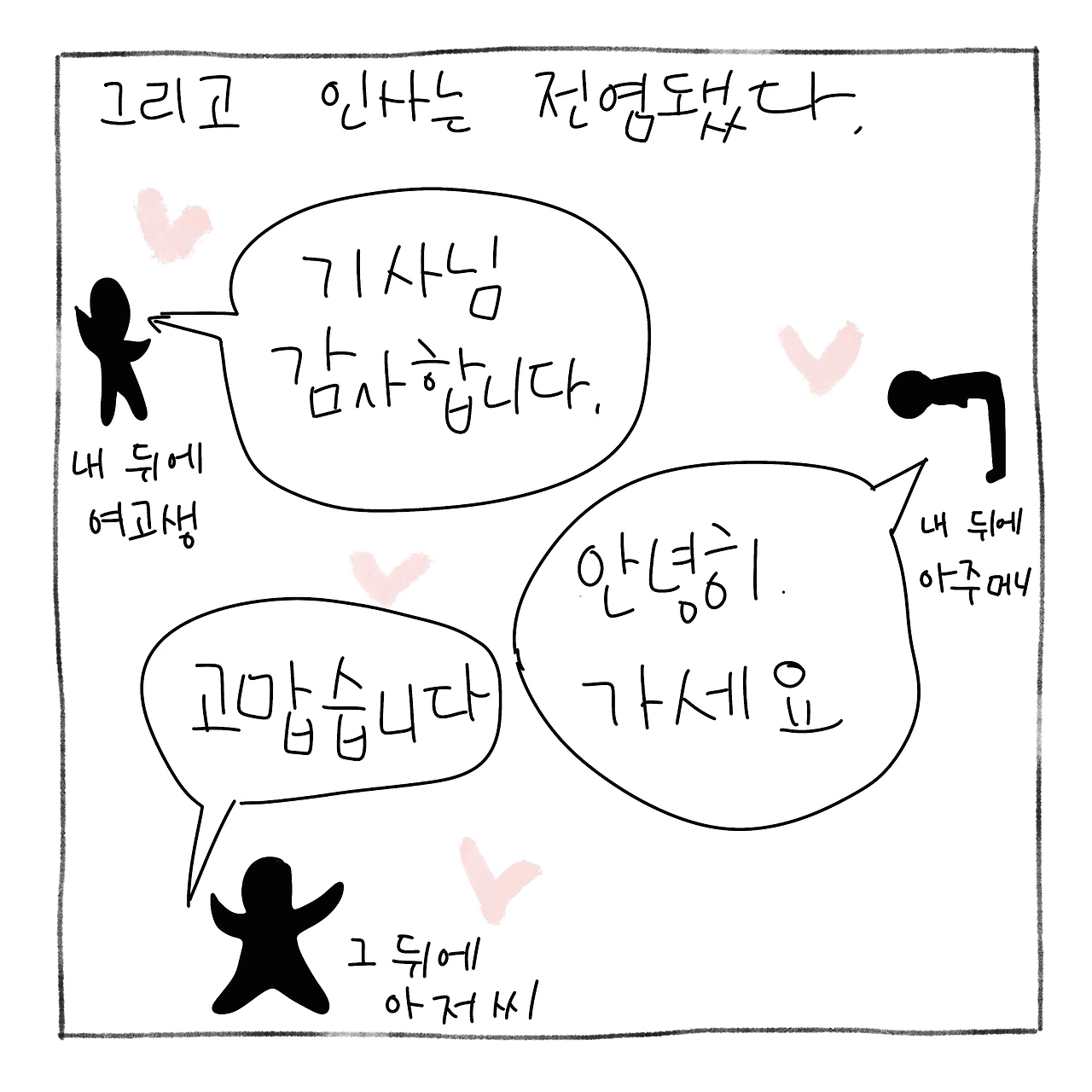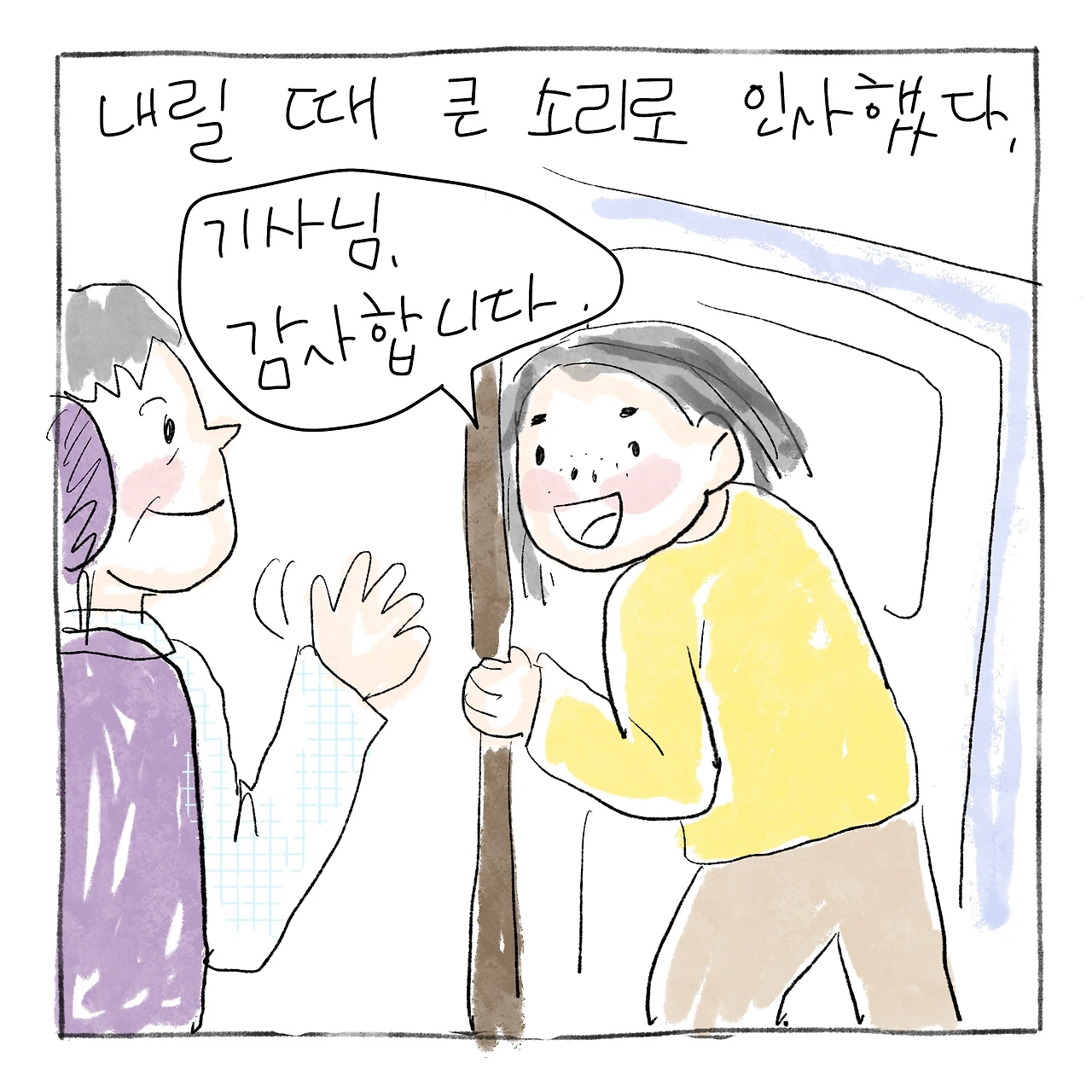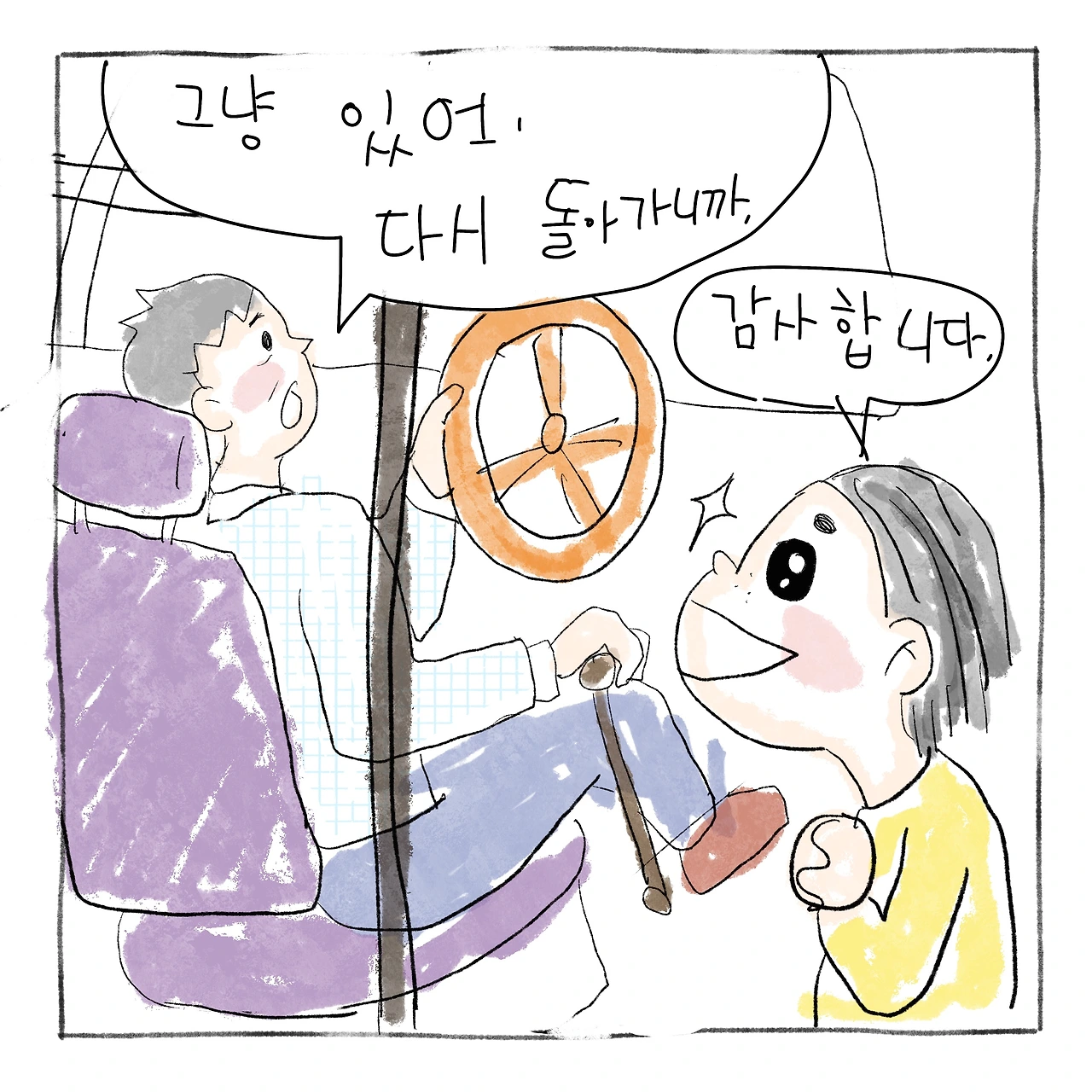 ”그냥 타고 있어. 다시 돌아가니까. 퇴촌까진 한 시간 걸려요.“