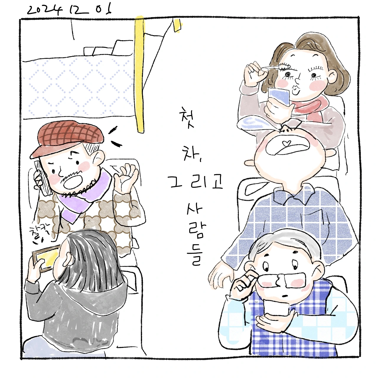 전화하는 사람, 화장하는 사람, 자는 사람, 핸드폰 보는 사람 , 그리고 창 밖을 찍는 나.