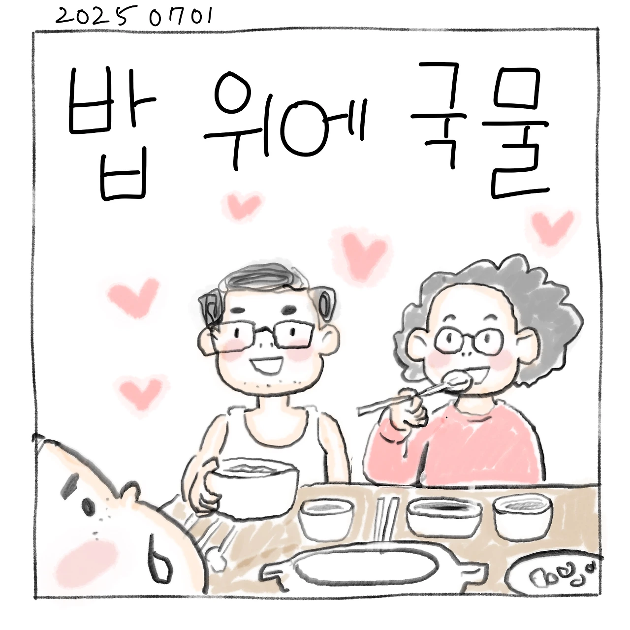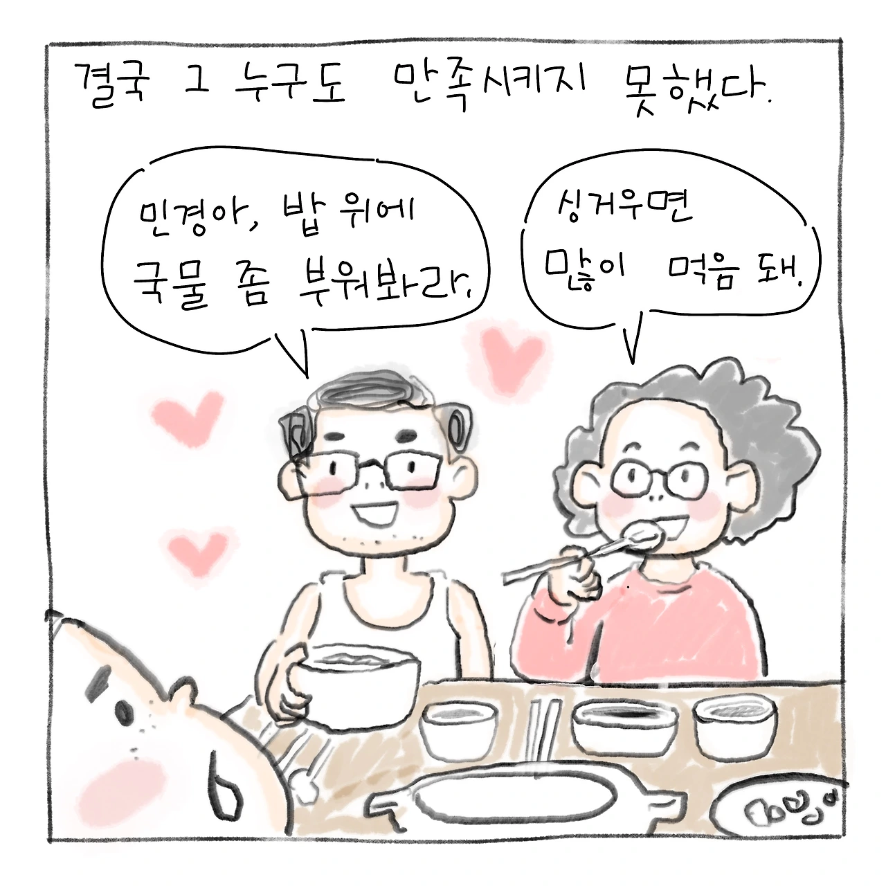 ”민경아 밥 위에 국물 좀 부워봐라.”