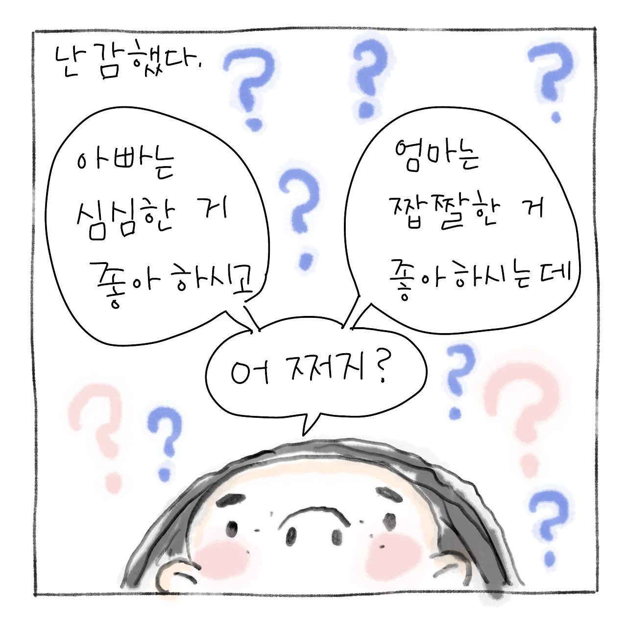 ’아빠는 심심한거 좋아하시고 엄마는 짭짤한거 좋아하시는데 어쩌지?‘