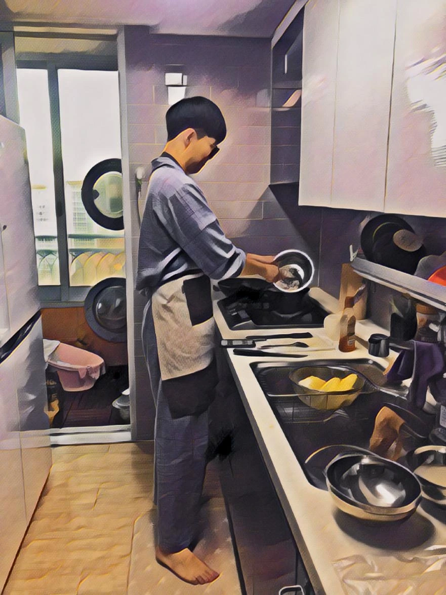 평생은 무리라도 이 기간만큼은 출산 이후 힘든 아내에게 물 한 방울 안 묻히고 살게 해주고 싶었다. 그러니까 자연스럽게 앞치마를 매게 된다. 아내는 자꾸 앞치마가 잘 어울린다고 칭찬해 준다. 너무 속이 보이는 칭찬이기는 하지만 그냥 넘어가 준다.