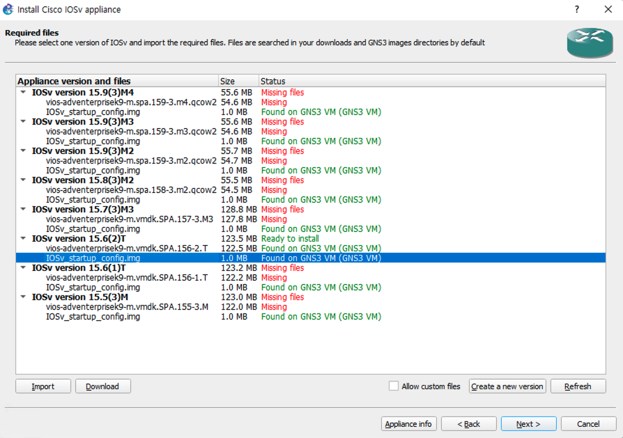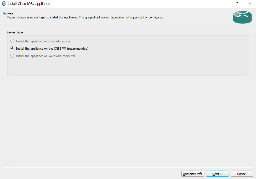 "Install the appliance on the GNS3 VM(recommended)" 선택하고 "Next"을 클릭한다.