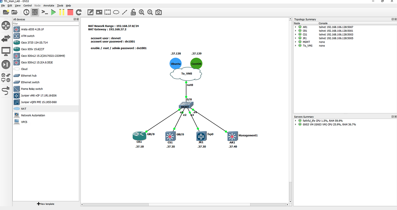 위 작업들을 마무리 했다면 GNS3 템플릿에 Cisco, Juniper, Arista 장비들이 보일 것이고, 사용할 장비들을 Drag하여 아래와 같이 랩을 구성할 수 있습니다.