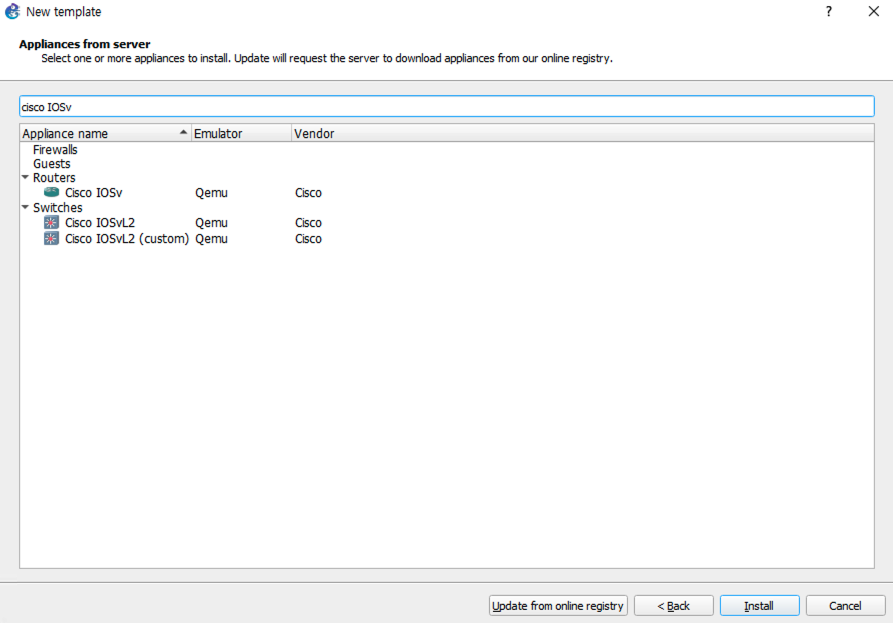 Filter에 설치할 이미지 정보를 넣는다. "cisco IOSv" 그리고 관련된 템플릿을 선택하고 "Install"을 클릭한다.