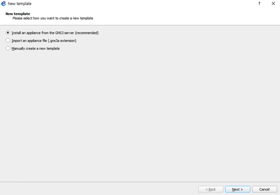 "Install an appliance from the GNS server(recommended)"을 선택하고 "Next"을 클릭한다.