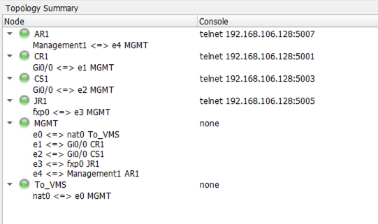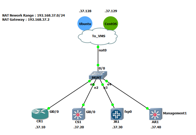 그림에 보이는 Ubuntu와 CentOS는 VMWare에 VM으로 설치된 장비로 실제 GNS3에서는 해당 장비가 보이지 않습니다. 따라서 구축된 Cisco, Juniper, Arista 장비들은 NAT을 통해서 Ubuntu와 CentOS 서버에 연결이 진행됩니다.