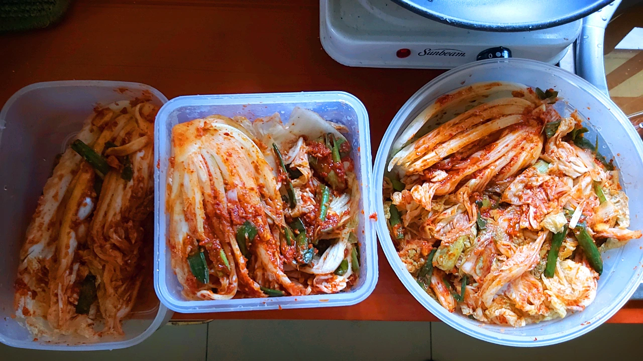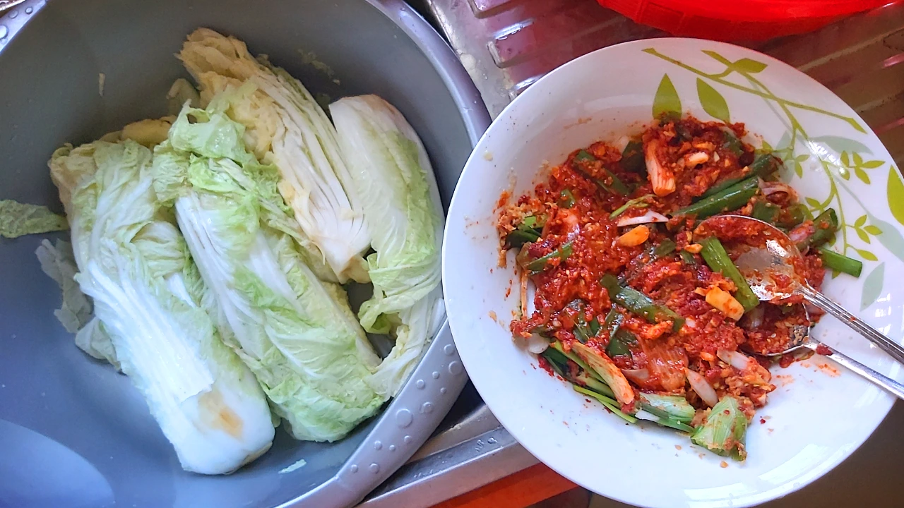 전날 시내에 나가 배추와 재료를 사 와 눈 뜨자마자 배추를 씻어 소금에 절여놓고 양념을 만들었다. 추석 때 한국에서 받은 고춧가루와 설탕, 깨소금과 피쉬 소스를 넣고 마늘과 생강을 갈아 파와 함께 섞었다. 그리고 절인 배추를 물에 헹궈 배추 속 겹겹이 양념을 버무렸다.