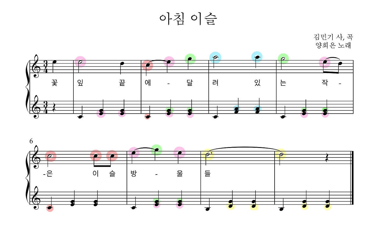 아래 악보에 같은 음을 같은 색깔로 표시했다. 멜로디에 나온 음이 화음에 포함되는 게 잘 보인다.
