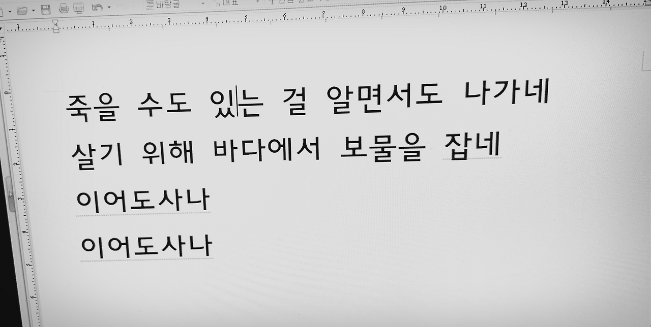 책을 읽고 그와 관련된 생각을 적어 정리한 뒤 돌아가며 한 소절씩 멜로디를 붙여볼 수도 있다. 예를 들자면, 그림책 <엄마는 해녀입니다>를 읽고 나서 해녀들의 삶을 관찰한 짧은 다큐멘터리를 감상한다. 제주 해녀들이 부르는 '이어도 사나'와 그것을 변주한 여러 장르의 곡들을 들어본다. (합창, 독창, 힙합 등 다양하다) 그렇게 감상이 모이면 돌아가면서 느낀 점을 말하고 화면에 문서창을 띄워 함께 정리한다. 여기까지 오면 거의 다 된 것이다. 나는 건반을 치면서 우리가 쓴 가사에 한 소절씩 가락을 붙이도록 유도한다. 용기 있는 아이들이 먼저 입을 열고 다함께 돌아가면서 가락을 붙여본다. 녹음도 하고 채보도 할 수 있다면 좋다. 정리한 노래를 다같이 다시 배워보고, 여러 번 합창하며 마무리 한다. 아이들 모두가 함께 만든 노래가 고요히 울려퍼질 때 오소소 소름이 돋는다.