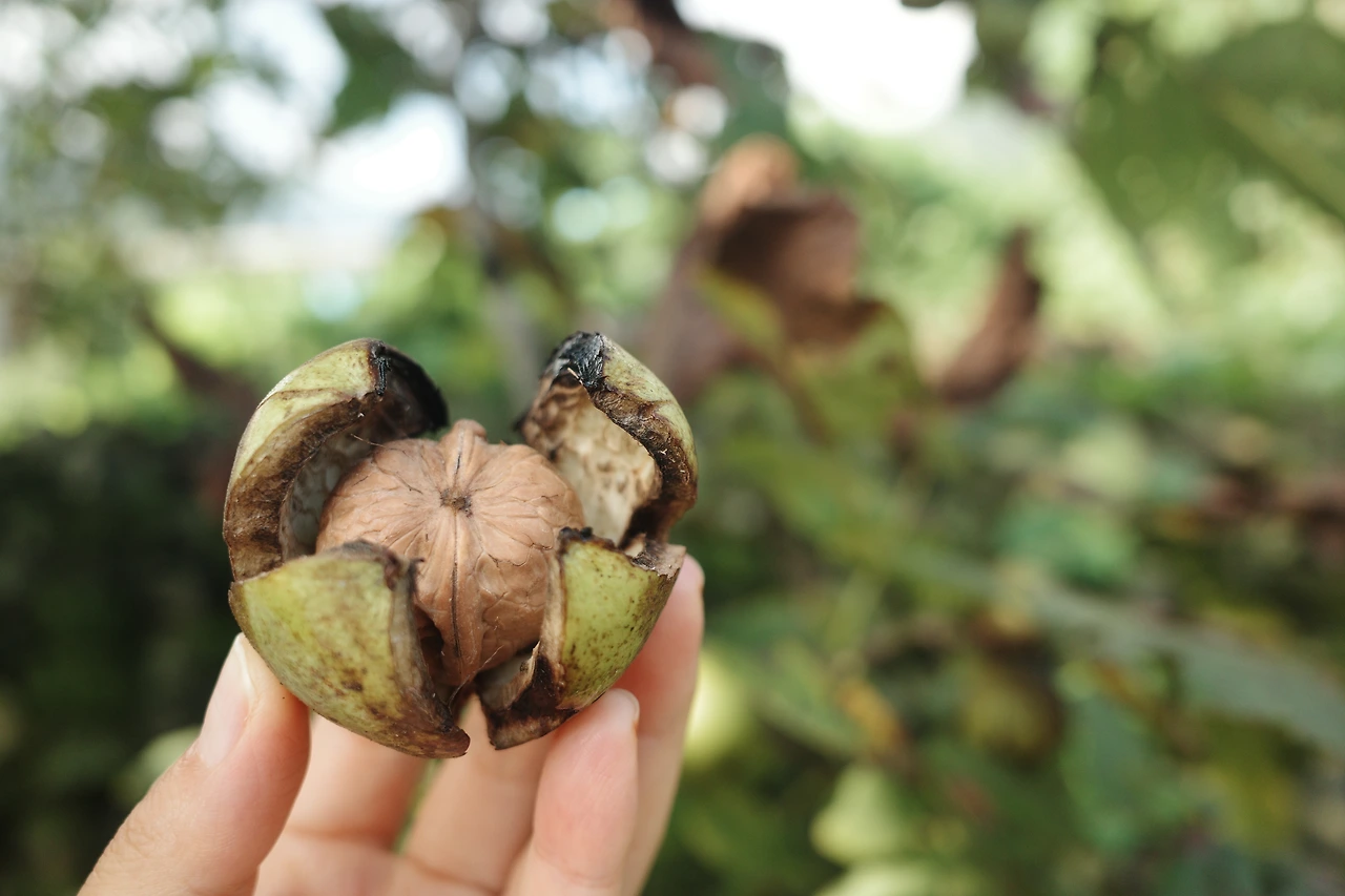 탁구공 만한 초록색 열매. 외가 뒷마당에 있던 호두나무의 모양새가 떠올랐다. 겉껍질을 잘못 까면 손에 물이 들어 밤처럼 신발로 껍질을 깠던 기억이 났다.