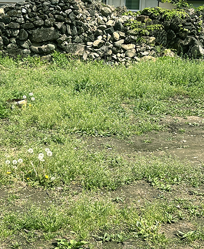 이제 그 정도 즈음되니, 풀은 더 이상 못 뽑아낼 것 같다는 결론에 다다랐다. 그때부터는 풀이 잔디처럼 보이기도 했다. 다 뽑지 못한 거라면 그냥 초록색이니까 잔디처럼 생각하기로 하고, 너무 길게 자라지만 않게 낫으로 쳐내었다. 마치 잔디 깎기로 잔디를 자르는 것 마냥 인간 잡초 깎기가 되어 마당에 쪼그리고 앉아서 낫으로 풀을 쳐냈다. 그러고 나서 갈퀴로 긁어 한 군데에 모으면 풀 더미가 수북하게 쌓여있었다. 그렇지만 그렇게 잘라내도 이주일이 채 되기 전에 풀이 또 자라나 있었다.