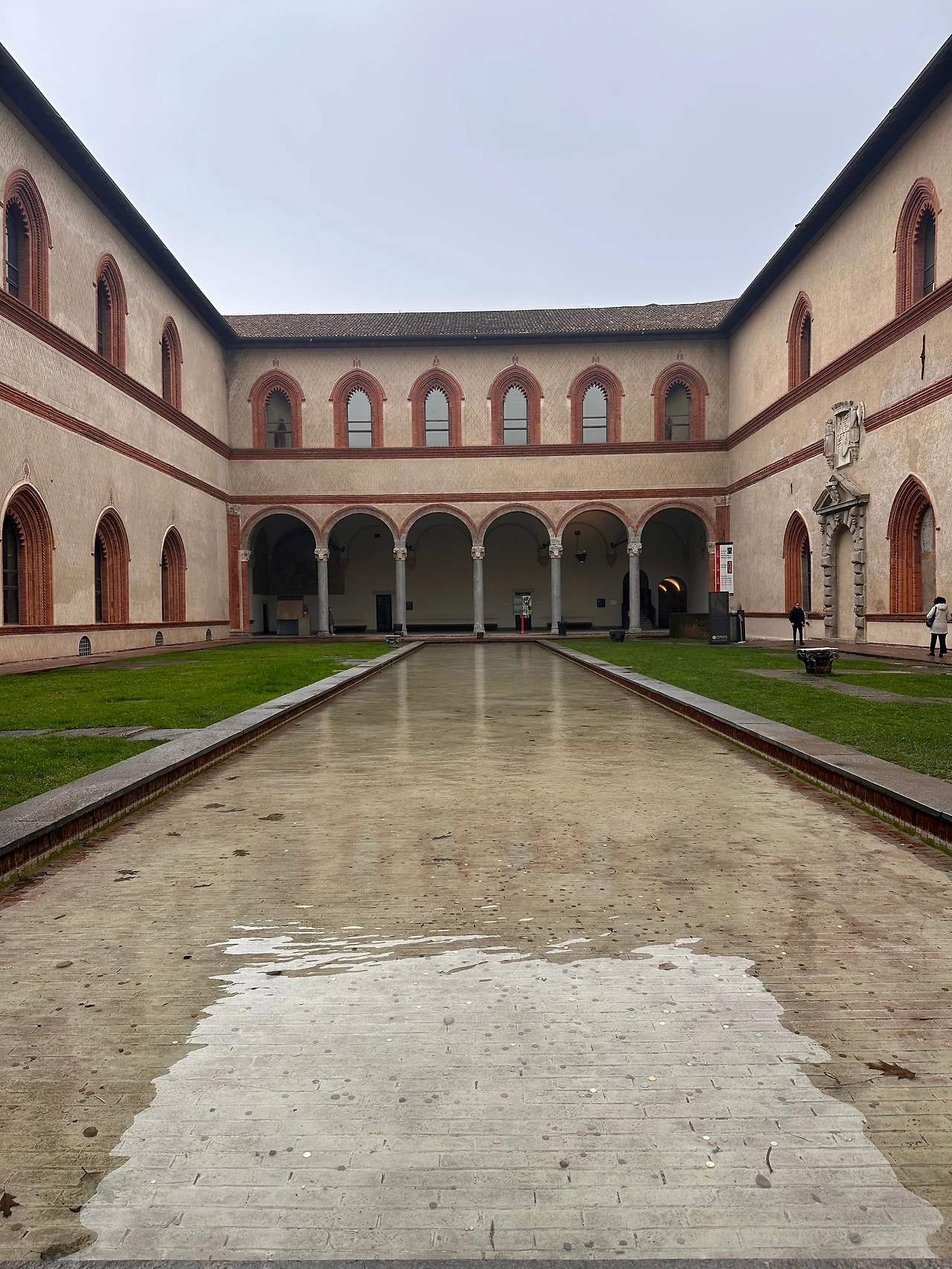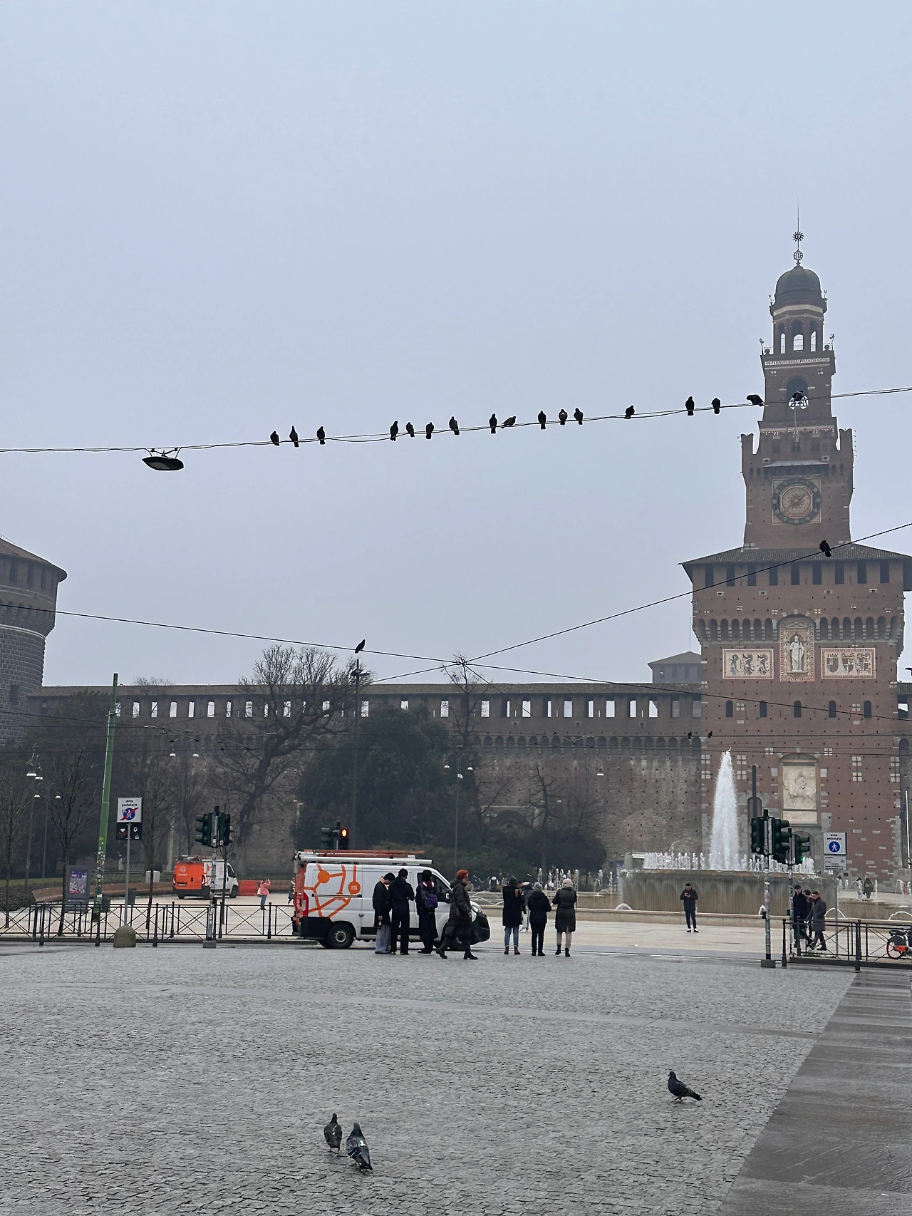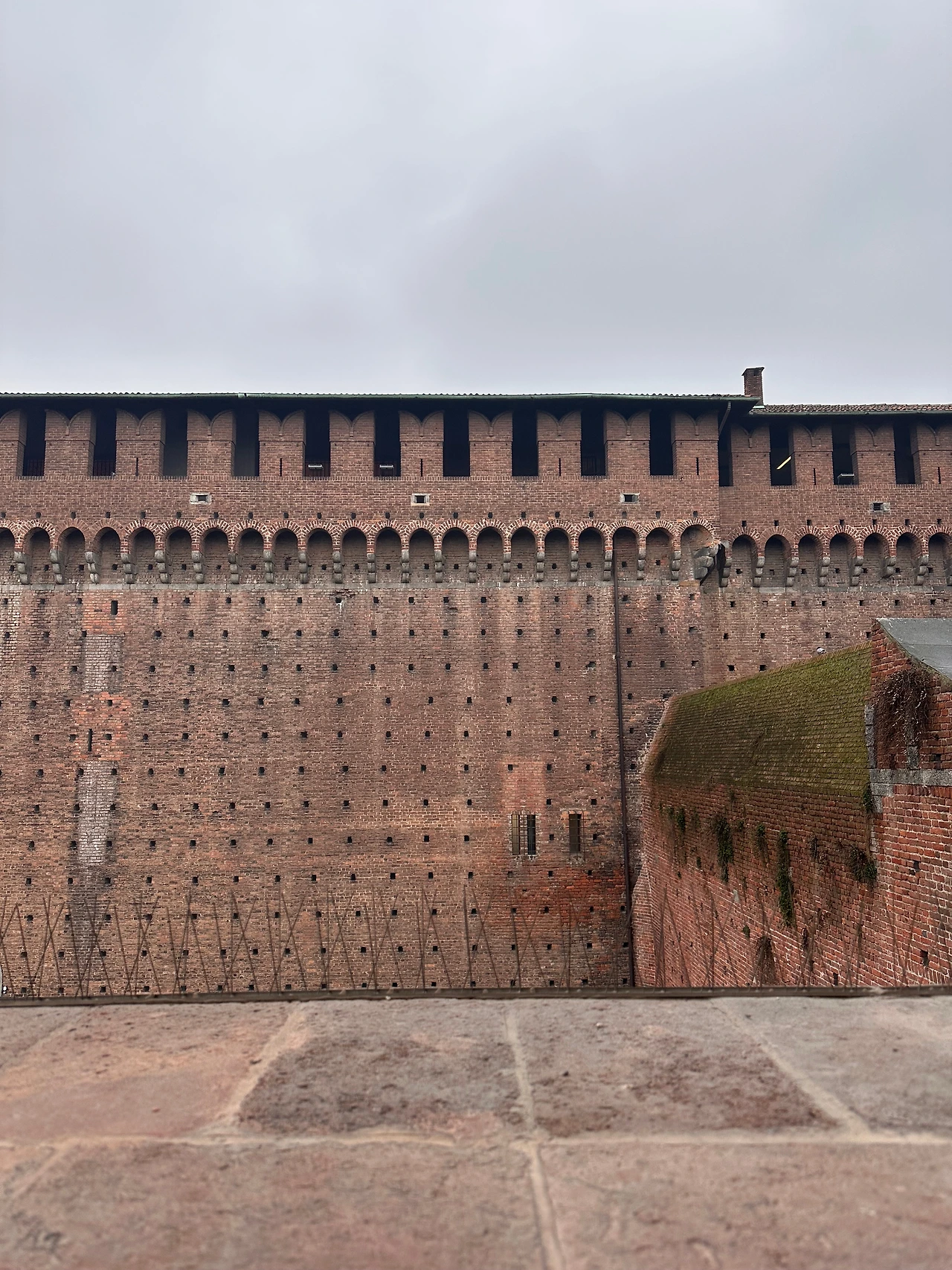 이러한 빛 속에 오래 있으면 기분이 가라앉기도 한다지만, 적어도 이 순간만큼은 시각적 안정감이 주는 사색의 시간이 소중했다. 스포르체스코 성의 붉은 벽돌도, 광장을 오가는 모든 움직임들도 회색필터를 통과한 듯 가라앉아 있다.