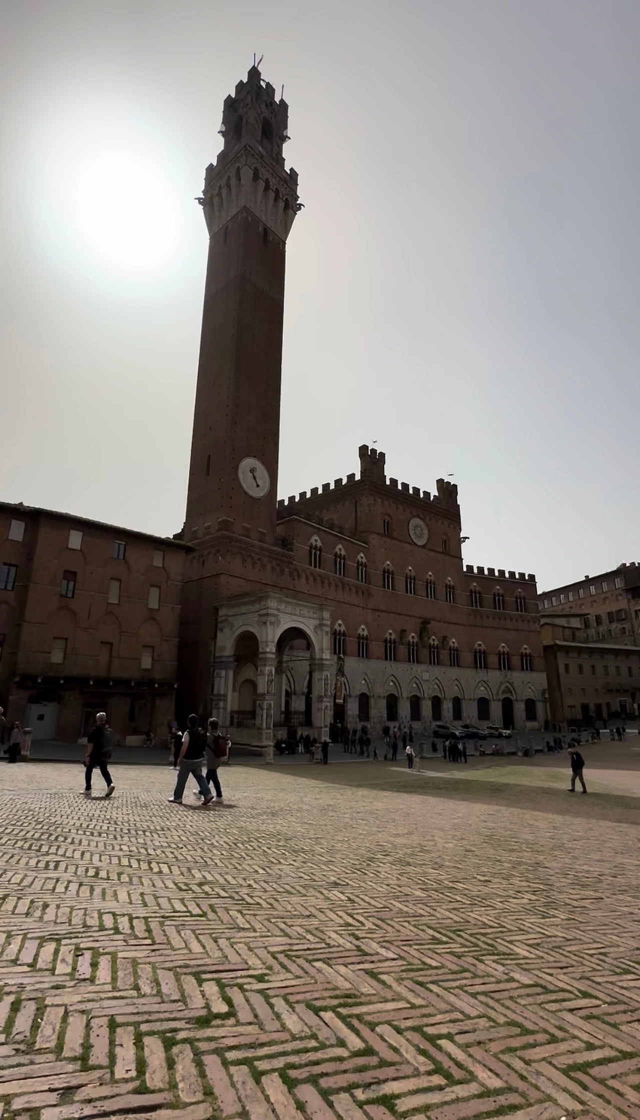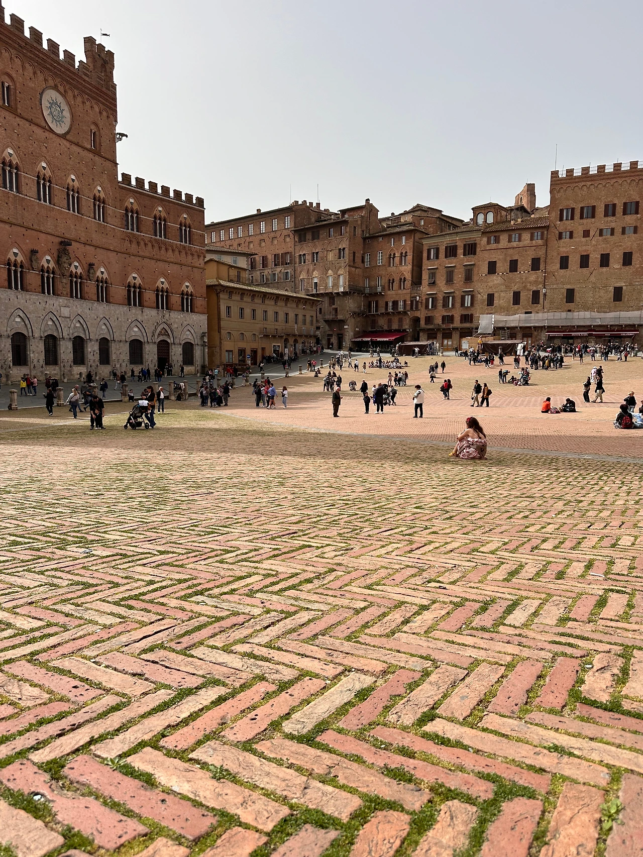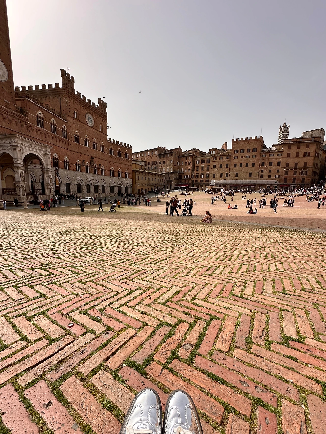 나는 광장 주변을 서성이며 맴돌다가 어느 경사면에 자리를 잡고 앉았다. 전면에는 종탑인 토레 델 만자(Torre del Mangia)가 하늘 끝을 향해 치솟아 있었다. 과히 피렌체의 두오모 종탑과 대결 구도를 형성했을 법하는 생각이 든다. 늘 경쟁과 전쟁 속에서 살아남기 위해 고군분투했던 시에나 시민들의 모습이 광장 위에 어른거렸다. 그다음으로 눈길을 끈 것은 푸블리코 궁정(Palazzo Pubblico)으로 경사진 광장의 가장 낮은 지점에 자리해, 부채꼴 모양의 바닥의 끝 점이 모이는 그야말로 모든 시선이 집중되는 위치에 자리했다. 그 주변으로는 귀족들의 주택이 광장을 둘러싸고 있었는데 통일된 지붕선과 재료는 정해진 규격을 지켜 일체감을 이루고 있었다.