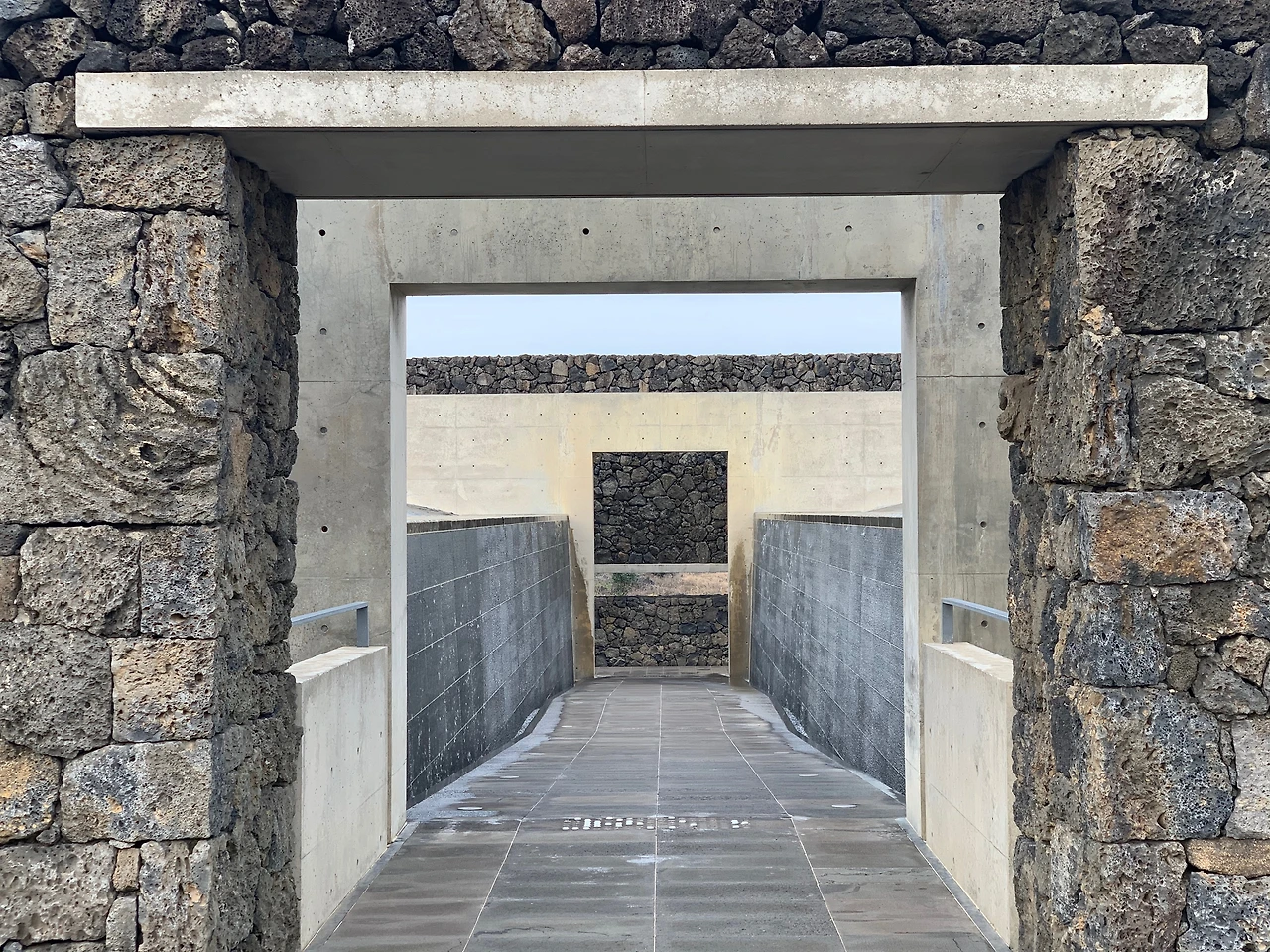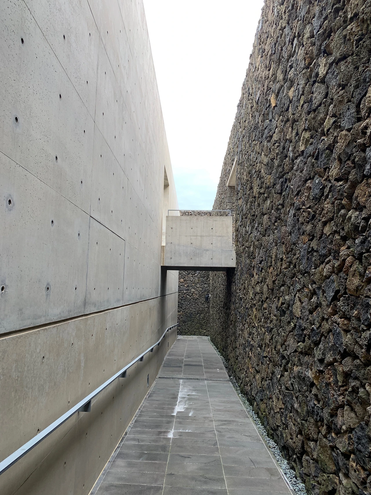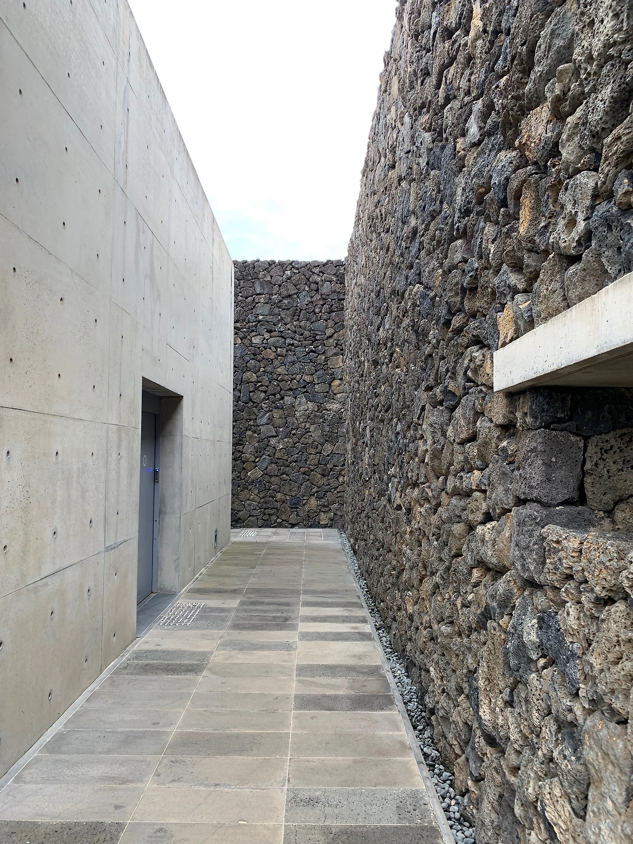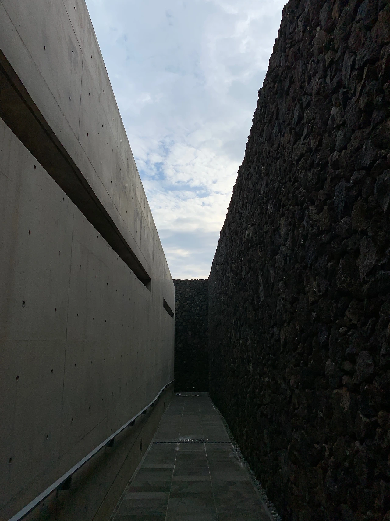 입구에 들어서자 노출 콘크리트와 현무암 벽이 좌우에 마주 보고 서있다. 이들은 서로 다르지만 결코 서로를 밀어냄이 없어 보인다.
