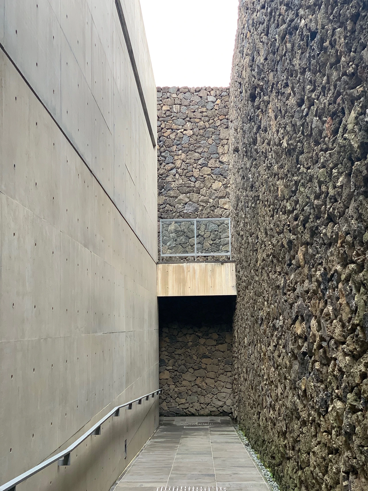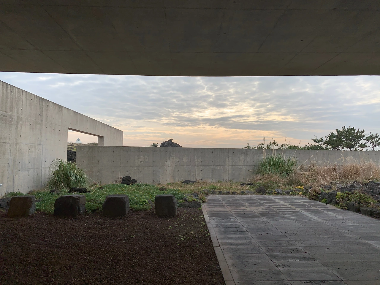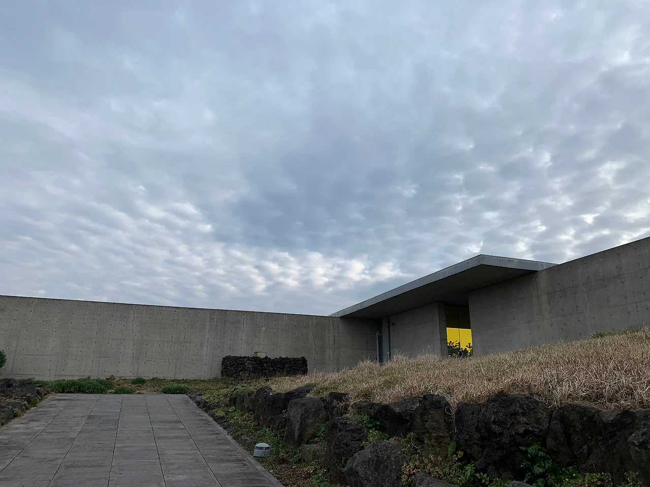 입구에 들어서자 노출 콘크리트와 현무암 벽이 좌우에 마주 보고 서있다. 이들은 서로 다르지만 결코 서로를 밀어냄이 없어 보인다.