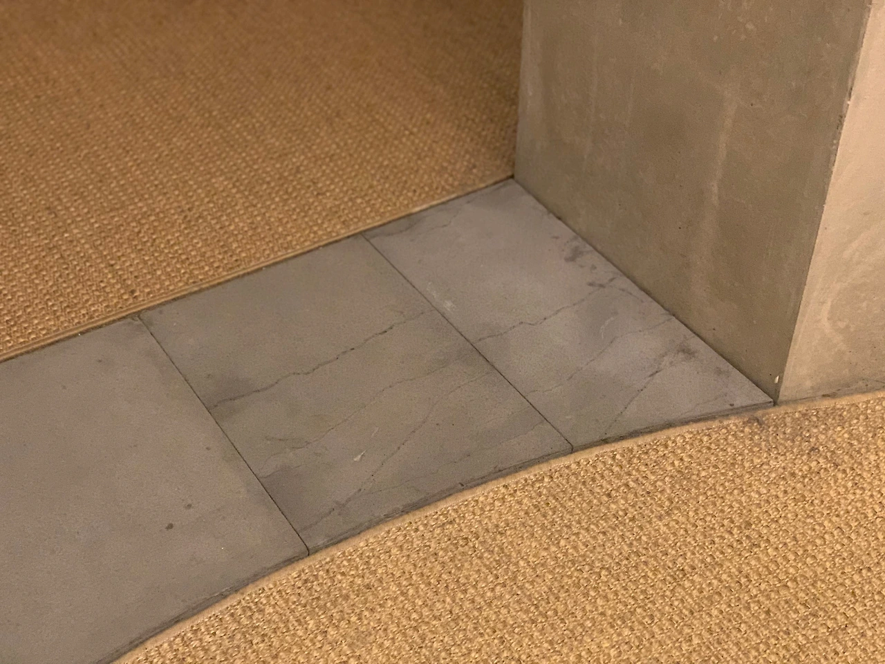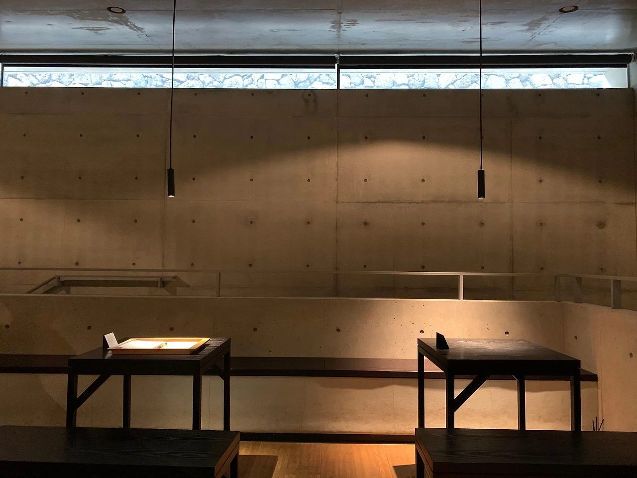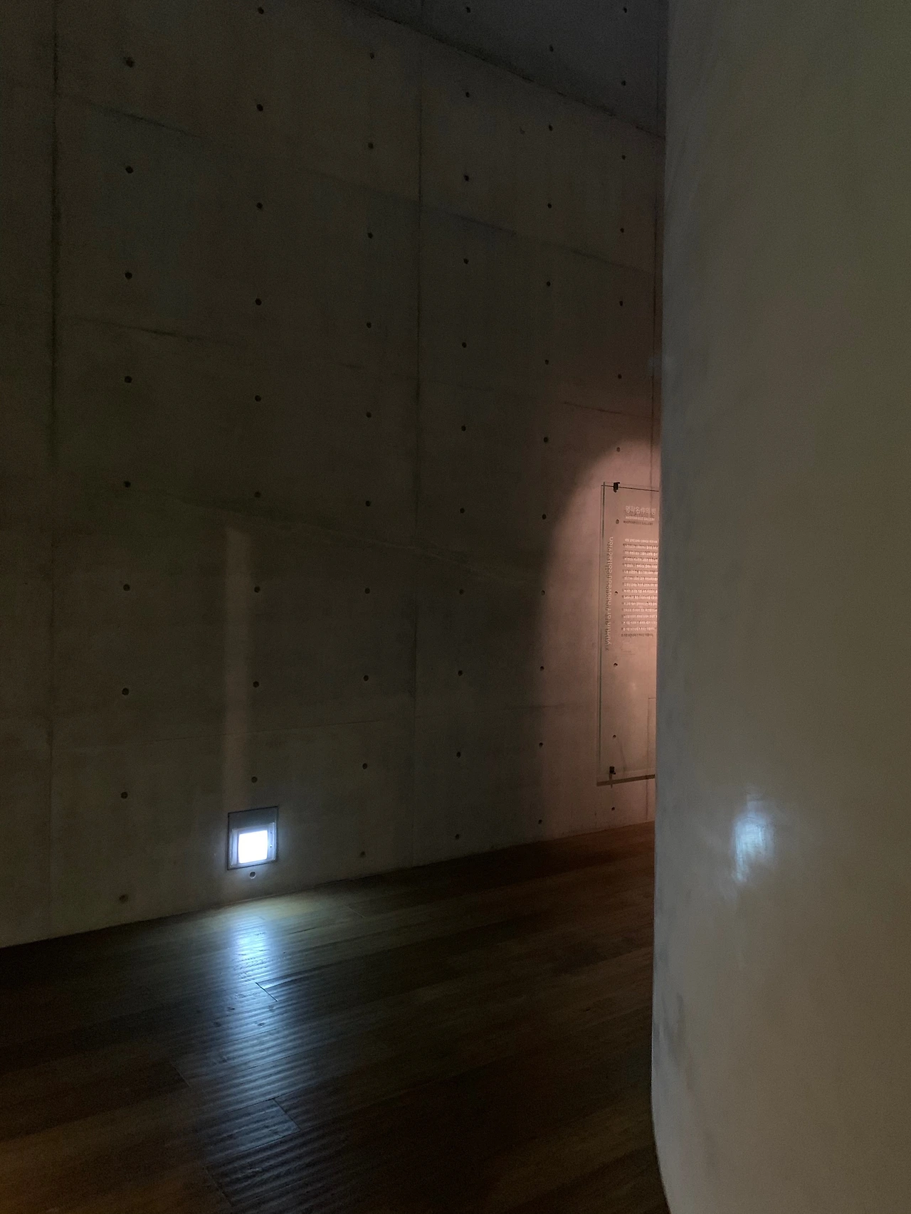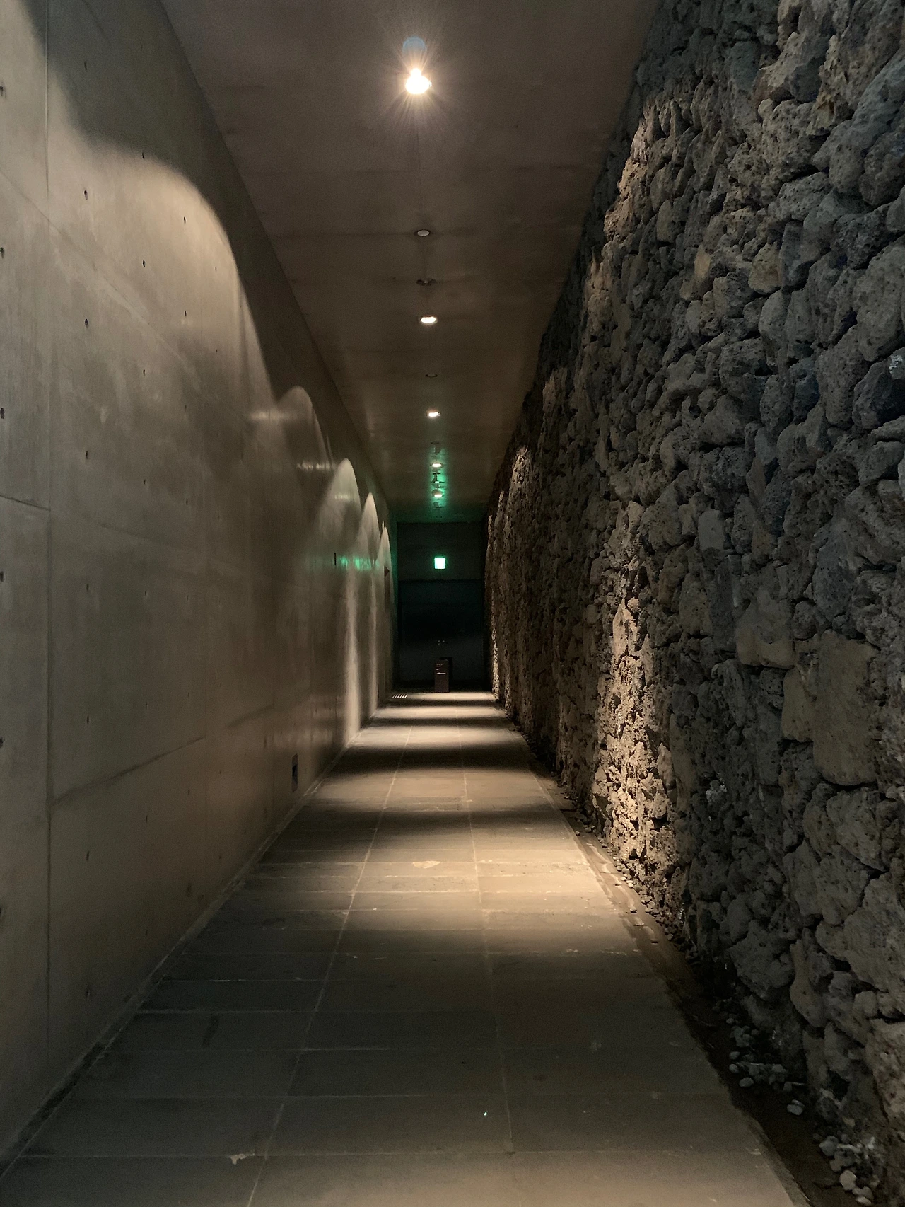 입구에 들어서자 노출 콘크리트와 현무암 벽이 좌우에 마주 보고 서있다. 이들은 서로 다르지만 결코 서로를 밀어냄이 없어 보인다.
