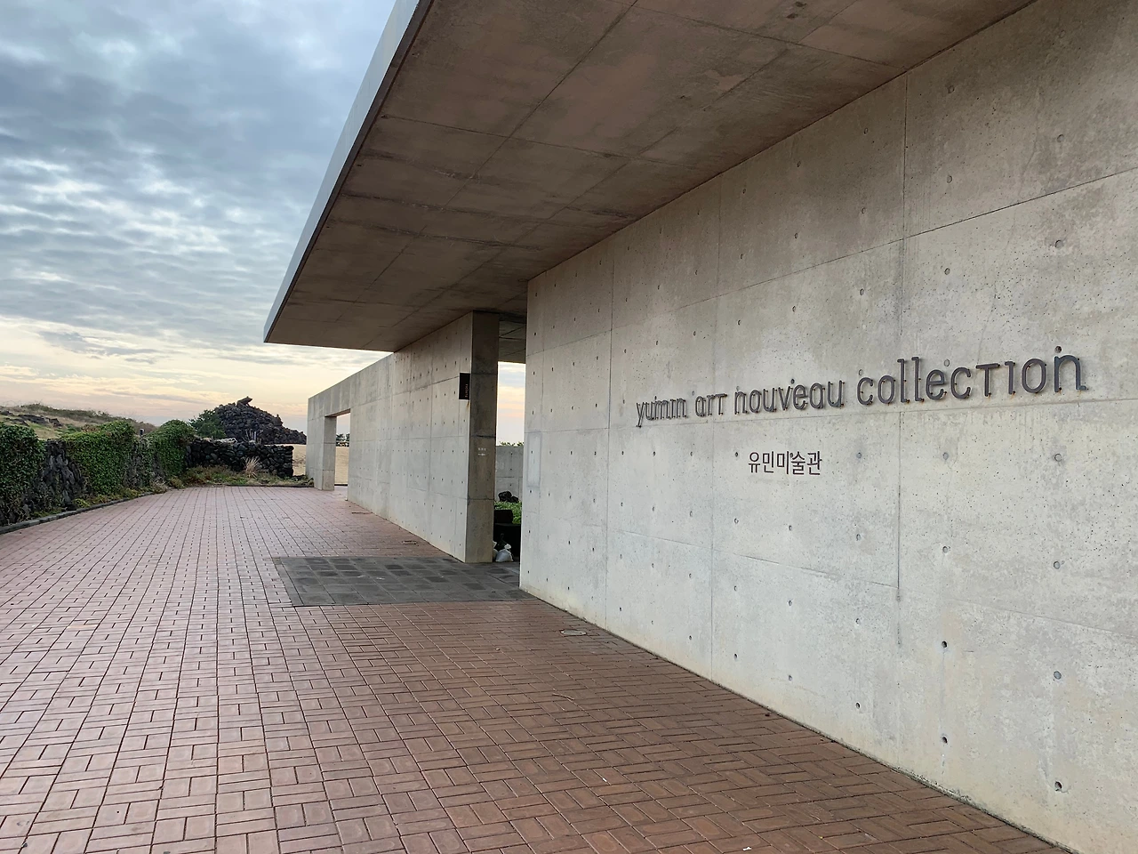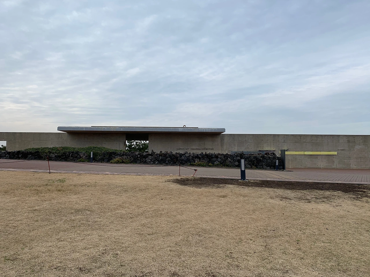 미술관의 얼굴은 반듯했다. 멀리 유채꽃밭에서 바라본 유민 미술관의 정면은 마치 언덕의 함께 그려진 그림처럼 자연스러웠다. 길고 긴 노출 콘크리트 벽면은 하늘과 지면 사이에 경계선을 그으면서도 도드라짐이 없었다. 건물의 우측에서 천천히 입구를 향해 걸으면, 내부에 대한 궁금증 때문에 급해진 마음의 박동이 느려진다. 오른편의 노출 콘크리트 벽면을 따라 벽면에 좁다랗게 부착된 거울을 통해 반대편의 모습이 반사되고, 제주의 돌로 쌓인 낮은 담장에서 현재와 과거가, 사람과 자연이 묘하게 어우러지는 것을 느낄 수 있다.