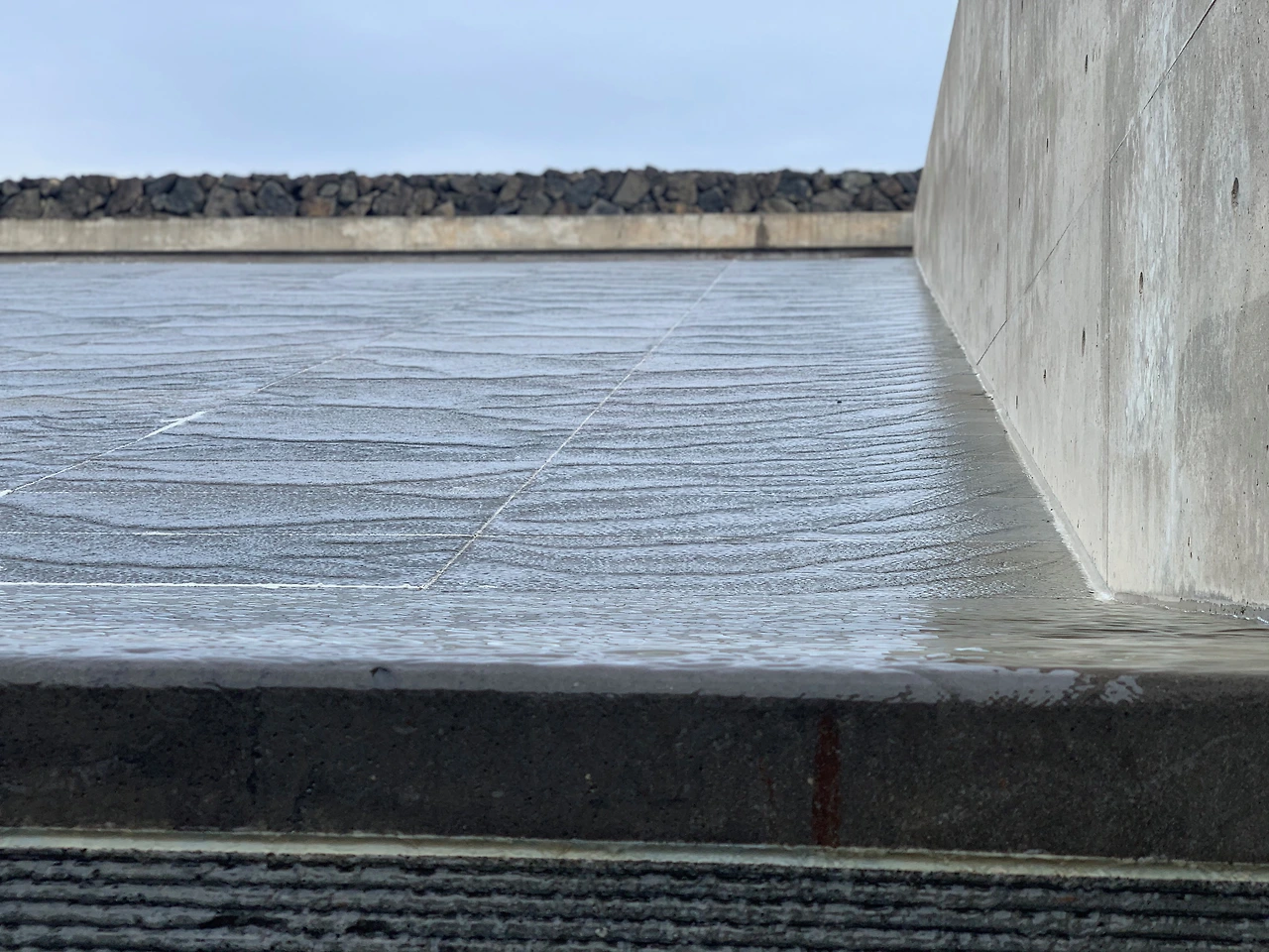 마주한 거친 현무암 벽면 안쪽에는 노출 콘크리트 벽면이 겹처지고 좌우로 물이 쏟아지는 좁을 길을 지난다. 그러면 또 한 번의 노출 콘크리트 벽면이 서 있고 그리고 마지막에 다시 현무암으로 쌓여진 벽면이 켜켜이 공간을 분할하고 있다. 이 공간의 중앙에 서면 양쪽 경사면에서 시원스럽게 물이 흘러 바로 아래로 떨어지고 있다. 쉼 없이 떨어지는 물소리는 관람자에게 이곳을 통과하면서 마음속의 온갖 잡음을 다 씻어내도록 하는 것 같았다. 자연의 소리에 마음이 닿으면 감정이 이토록 흔들리는 걸까? 한참을 물소리에 마음을 내어주었다.
