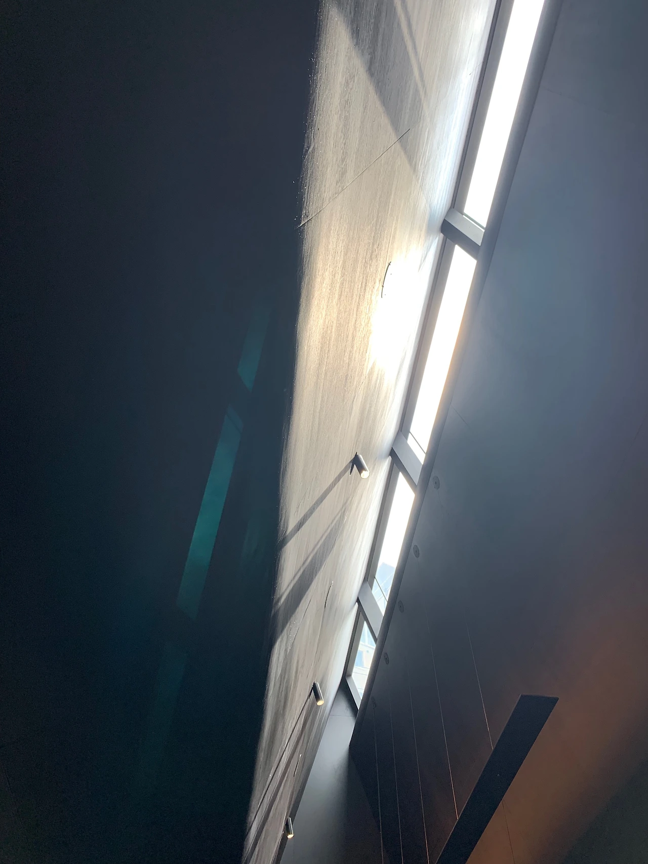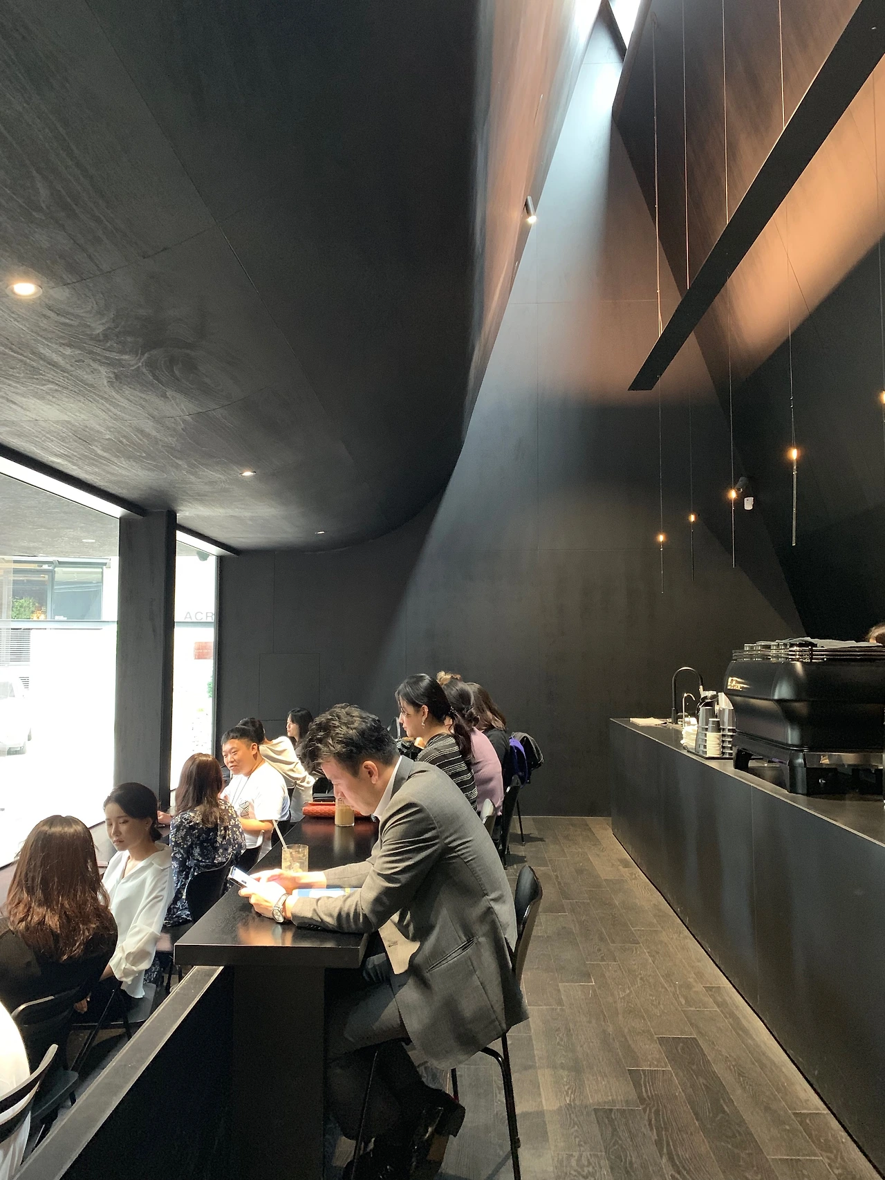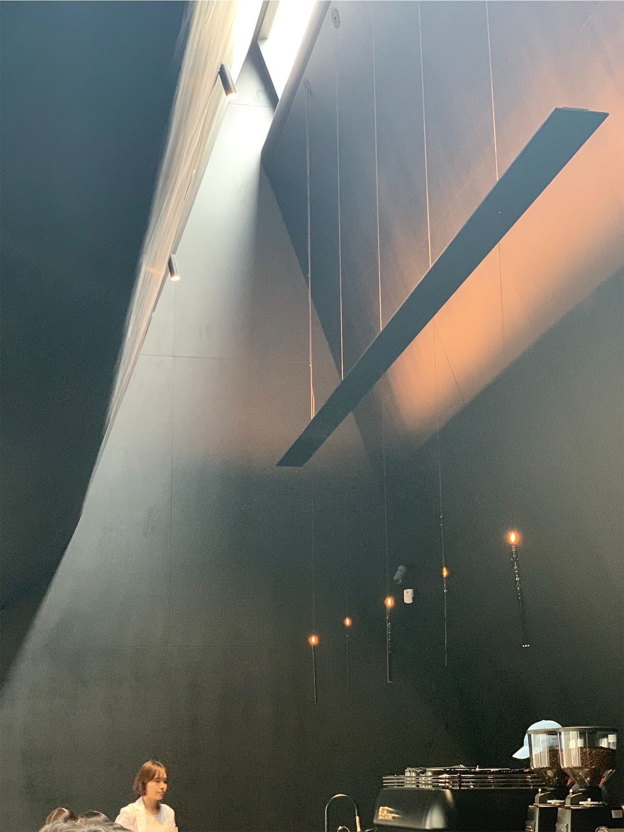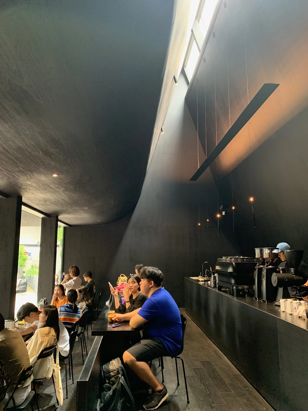 카페 안으로 들어서도 온통 검정이다. 검정의 긴 카운터 위쪽, 길게 뻗어 올라간 천정은 외관에서 보았던 좌측 삼각지붕, 날카로운 형태의 정체가 무엇인지 말해주고 있었다. 좁고 긴 공간에 속에 가파르게 솟아올라간 천정의 끝에는 빛을 드리우는 천창이 가늘게 지나고 있었다. 루이스 칸이 "카라칼라 욕장을 보라...... 2.5미터라고 해도 목욕을 하는 데는 아무 지장이 없다는 것을 모두가 알고 있다. 하지만 45미터라는 높이는 우리를 완전히 다른 사람으로 만든다"라고 한 의미를 알 듯했다. 고정된 천창을 통해 들어오는 변화하는 자연광의 움직임은 검은색 공간에 다양한 표정을 그려내었다.