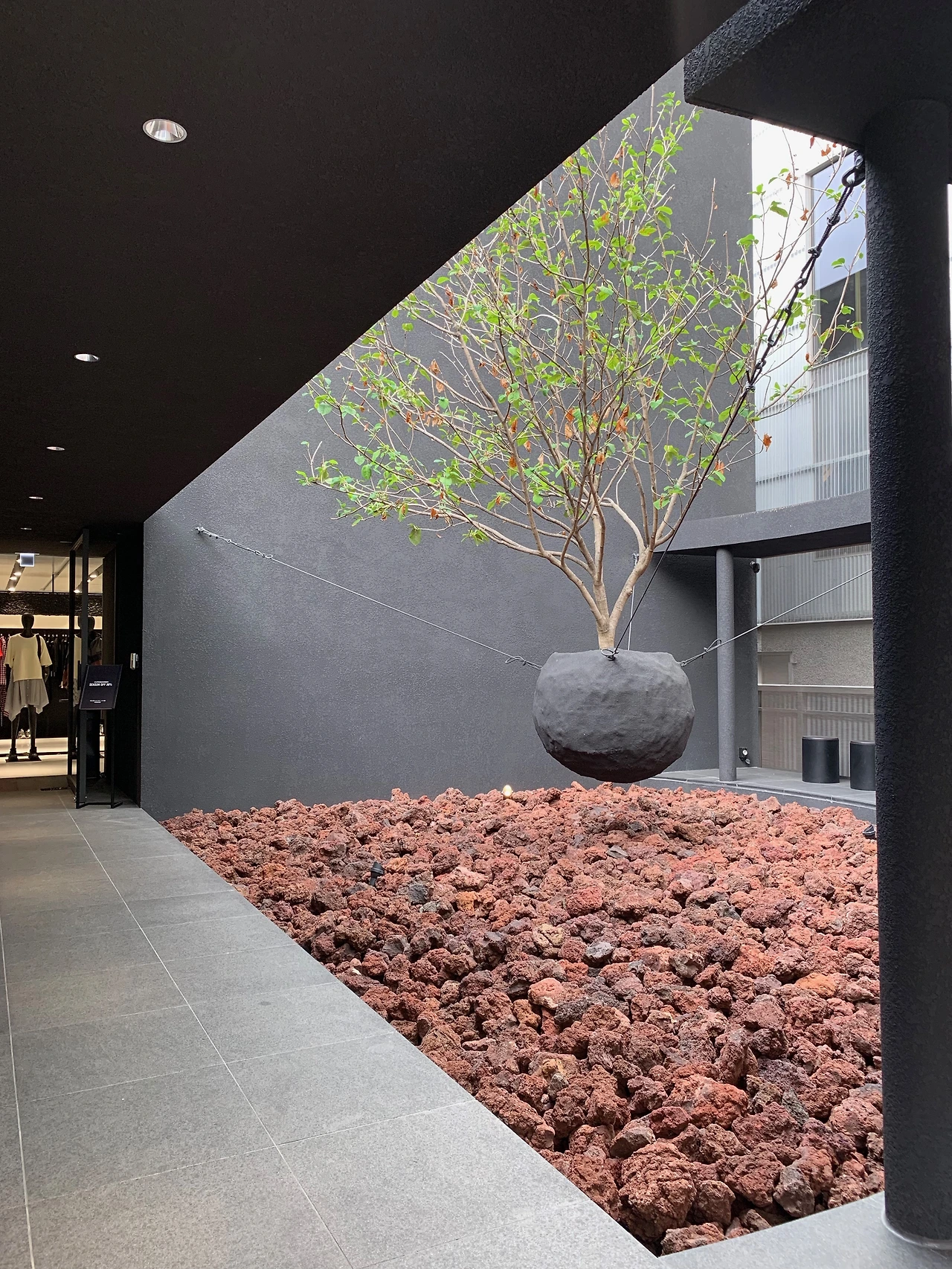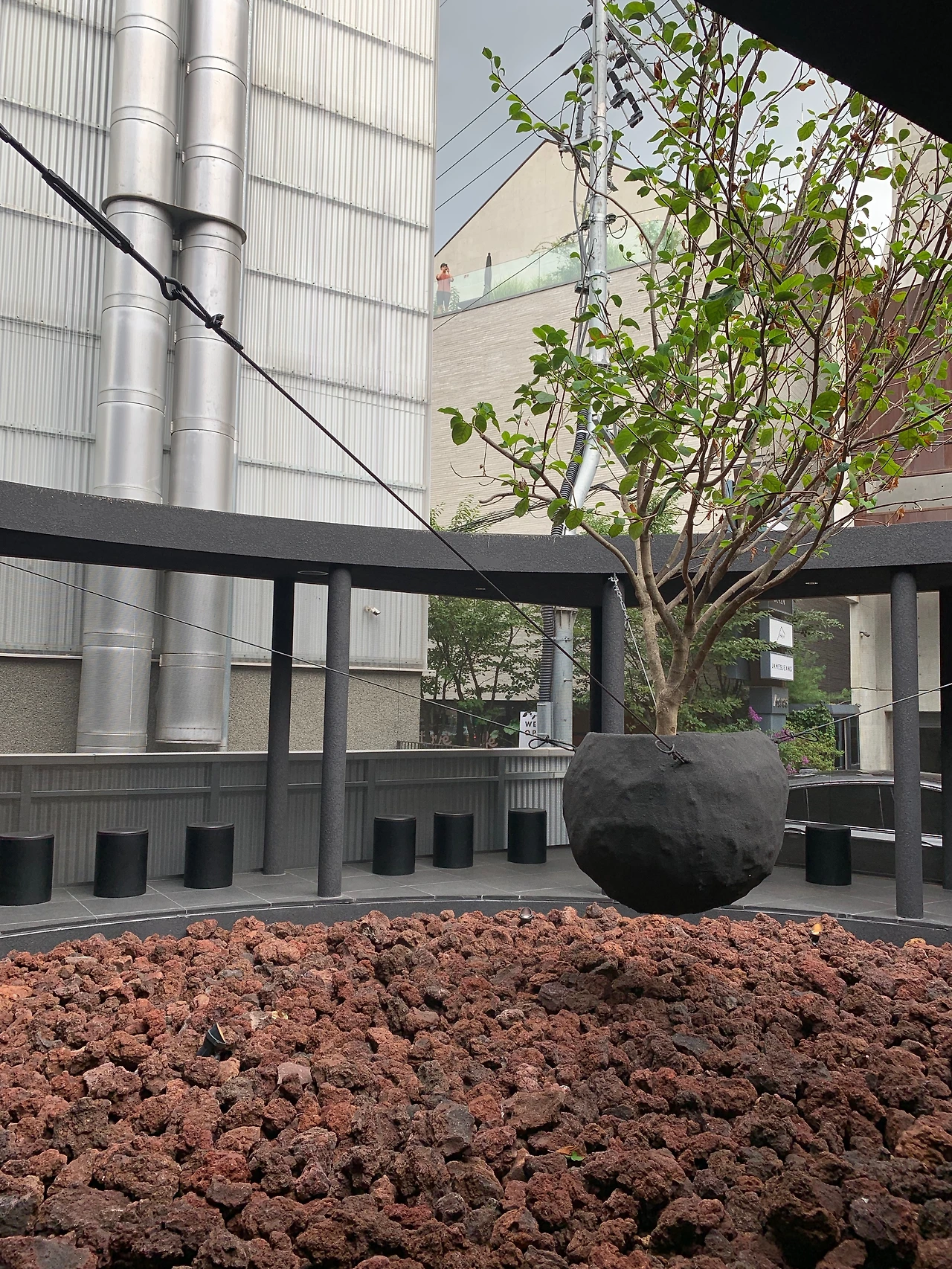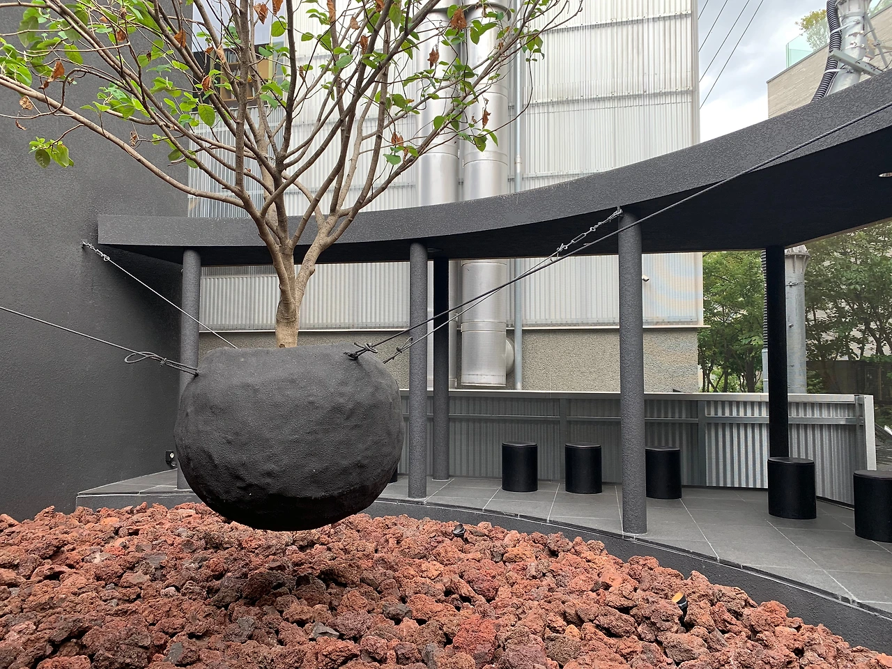 카페의 앞마당에는 붉은 돌이 마치 기름진 흙의 뭉치들처럼 가득 쌓여 있었고 나무 한 그루가 공중에 떠 있었다. 우리가 생각하는 나무의 모습은 어떠한가? 뿌리를 땅 깊숙한 곳에 감추고 몸체는 땅을 딛고 서 있어야 한다. 그런데 내가 보고 있는 나무는 그 모습이 다르다. 땅과 분리되어 공중부양 중이다. 아프리카에서는 검은색이 비옥한 토양의 색에서 유래되었고 다산과 변신을 상징한다고 하는데 나는 이 나무의 모습이 검정의 공간에서 피어난 풍요와 자유, 변화의 상징처럼 보였다. 이 초현실적인 풍광은 커피잔을 앞에 두고, 잠시 현실을 잊어버리고 싶은 사람들에게 막연한 상상력을 불어넣고 있는 듯했다.