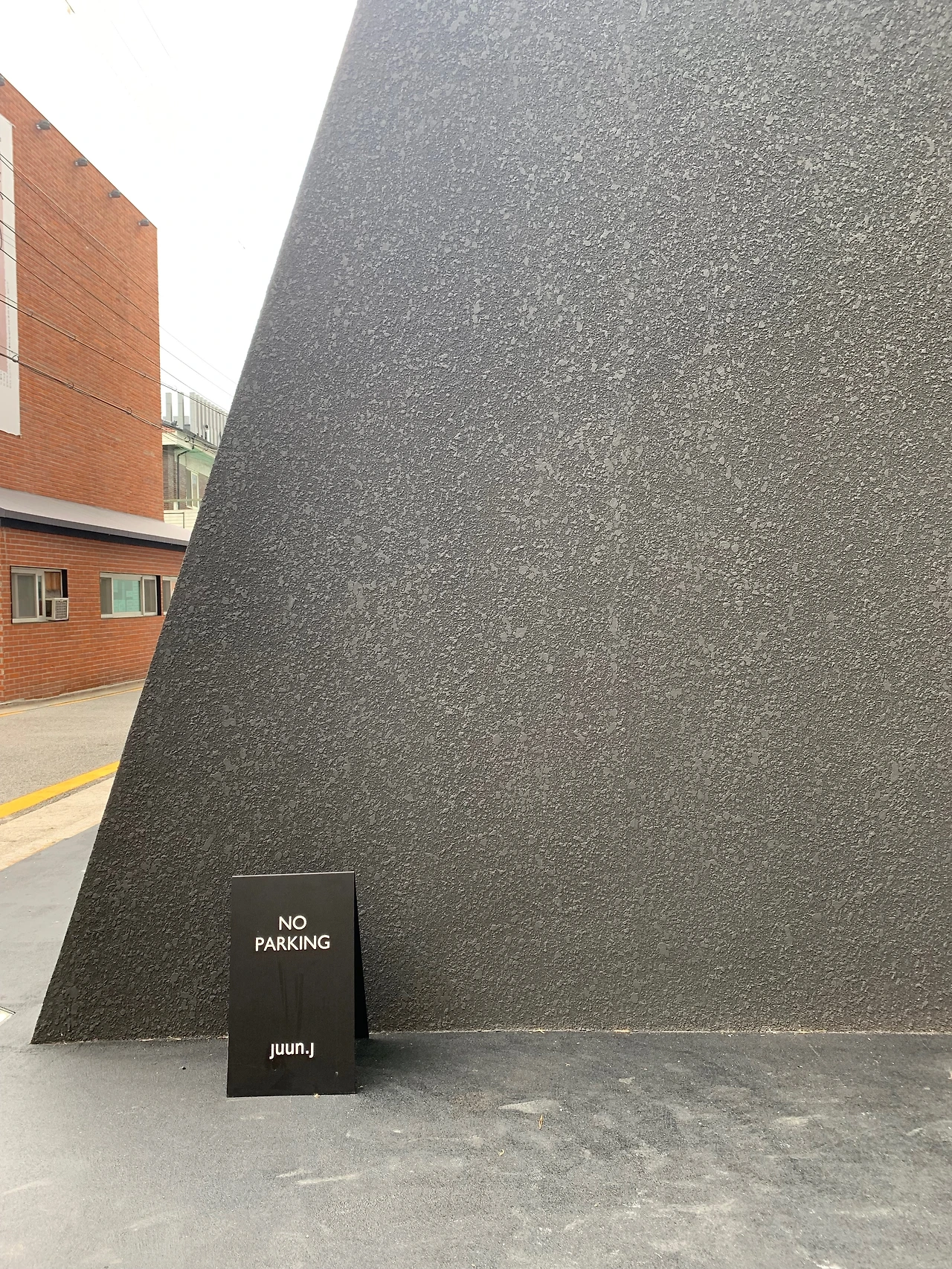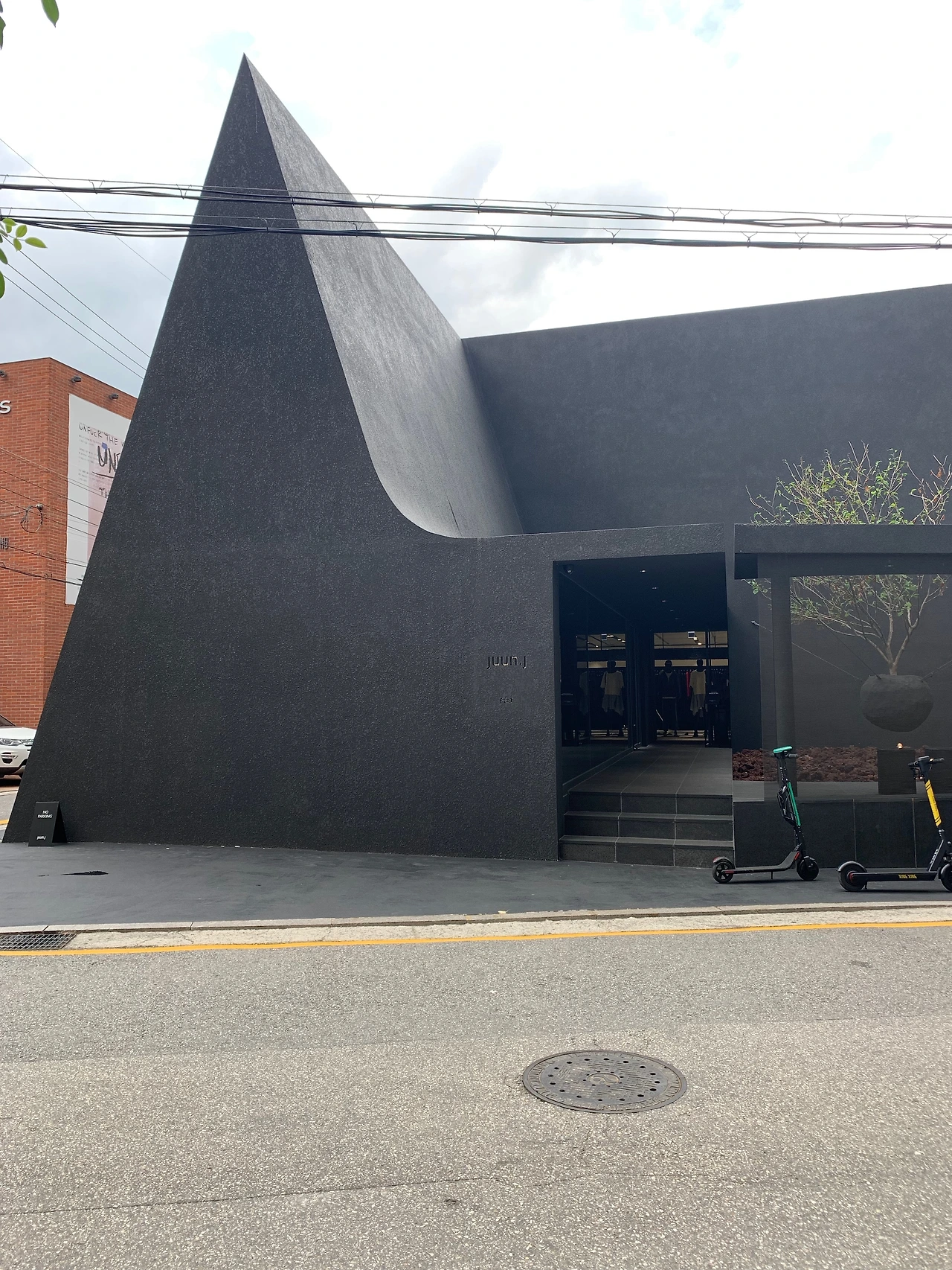 검정의 건물과 콘크리트 바닥 사이에 그어진 선명한 노란색 주차금지 선을 넘어 입구에 들어섰다. 계단을 오르니, 오른쪽에 중정이 한눈에 들어오고 왼쪽에는 카페가 보인다. 카페 건물인가 하고 보니, 안쪽에 JUUN.J라는 패션 샾이 있다. 패션 샾을 휘리릭 둘러보고 카페, Felt 안으로 들어갔다.