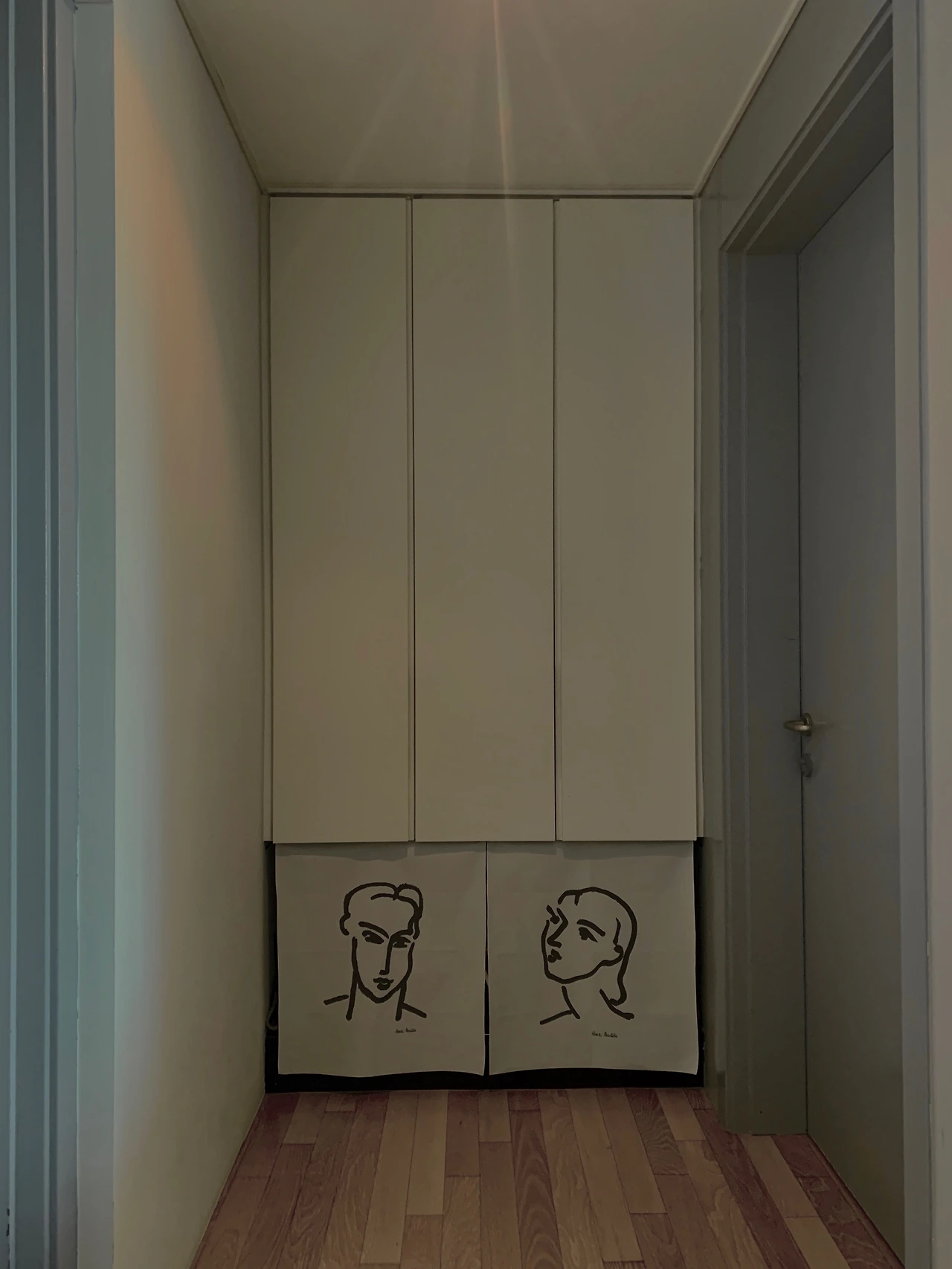 우리집 거실 복도 끝에는 수납장이 하나 있다. 수납장의 모양새를 보면 설계하신 분의 의도를 짐작할 수 있다. 전체 길이의 3/4을 차지하는 상단부에는 문이 달려 있으니 내부에 뭐든 수납을 하면 되고 나머지 1/4는 오픈시켜 놓았으니 그럴듯한 오브제라도 올려보시라는 것. 게다가 조명까지 매입되어 있으니 의도는 더욱 명확해 보였다. 하지만 살다 보면 조금조금 늘어나는 살림살이에 수납공간은 늘 부족해지고 오브제는 제자리를 잃어버리게 된다. 그래서 결국 그 자리에 이런저런 잡동사니들이 자리를 잡게 되는데 그것이 지나다닐 때마다 여간 눈에 거슬리는 게 아니었다. 그렇다고 문짝을 새로 달기에는 배보다 배꼽이 커지는 형국이다. 궁리 끝에 인터넷으로 천 두장을 구입하였다. 좀 더 정확히 말하자면 일반천은 아니고 벽걸이 용으로 제작된 패브릭이다. 희고 두툼한 천에는 앙리 마티스의 드로잉이 프린트되어 있는데 내가 기대했던 것보다 결과가 만족스럽다. 일단 벽걸이용이라 천이 흐들거리지 않아 목문 아래 달아도 기죽지 않고 단단히 버티는 힘이 있어 좋다.
