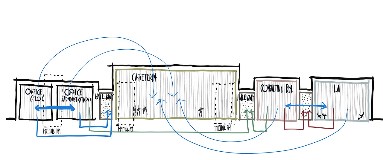 공간을 계획하기 위해서는 그 공간을 이용하는 사람들이 누구이고 그 공간에서 하는 일이 무엇인지를 파악하는 것이 기본이 된다. 특별히 사무공간을 계획할 때는 공간계획의 목표가 너무나 명확하다. 업무공간은 말할 것도 없고 휴게공간 역시 결국은 업무의 효율을 높여 기업의 이윤을 극대화하기 위한 공간임을 기억해야 한다. 그러므로 공간 사용자의 업무를 파악하고 그 흐름 Flow를 이해하여 공간을 구획 Zoning 하도록 한다.