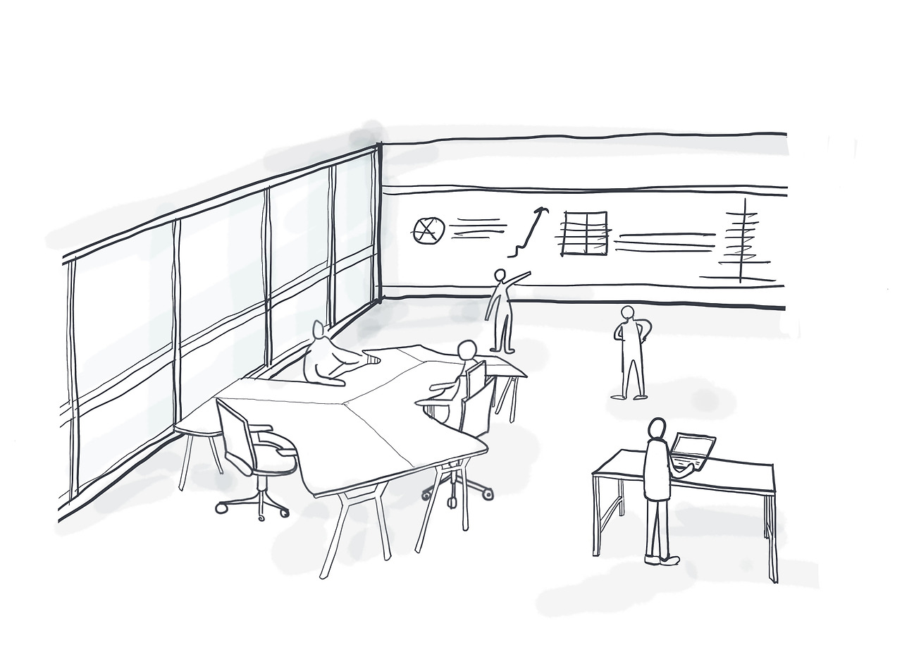 일단 사무실에서 휴게공간에 휴게공간이라는 이름을 붙여 놓으면 직원들은 그곳에서 맘 편히 쉴 수가 없다. 당연한 이야기이지만 창의공간이라고 어떤 공간을 만들어 놓으면 아무도 부담스러워서 들어가고 싶지 않을 것이다. 일과 휴식이 자유롭게 혼합된 공간에서의 몰두와 교류가 가능한 공간을 계획해 보려고 한다. 수년 전 TV 채널을 넘기다가 영국의 한 유치원의 독특한 자유놀이를 시청한 적이 있다. 아이들이 자유놀이에 빠져있다가 어느 순간 선생님이 사인을 보내면 아이들이 일제히 동작을 멈추고 허공의 한 점을 응시하는 하는 것이었다. 지금 생각해보니 그것이 일종의 멍 때리기인데 그 영상에서 한 교육전문가는 멍 때릴 때 폭발하는 창의력에 대해 설명했다. 멍 때림은 몰입과는 다른 일종의 비워냄이다. 그것은 생각보다 쉽지 않다. 오죽하면 "멍 때리기 대회"라는 것도 있다. 주변의 어떤 상황에도 요동하지 않고 마음과 몸의 상태를 유지해야 한다. 그래서 경기가 시작되면 대회 참가자는 심박수 체크를 받게 되는데 그래프가 가장 일정하게 유지되는 사람이 우승을 한다. 멍 때리기를 영어로 표현하면 Space Out이다. 오히려 이해가 쉽다. 지금 내가 있는 이 공간에서 벗어나 완전히 다른 차원으로의 이동, 그래서 현재의 주변에 영향을 받지 않는 어떤 상태로의 이동쯤으로 이해한다. 나는 직원들이 편히 멍 때릴 수 있는 공간을 계획하는 것이 휴식과 창의를 동시에 잡을 수 있는 방법이라고 생각했다. 그것은 공간을 규정하지 않고 애매하게 두는 것으로 시작한다. 즉 멍 때리면서 휴식하고 다시 몰두하고 주변과 교류하는 혼합된 공간의 계획이다.