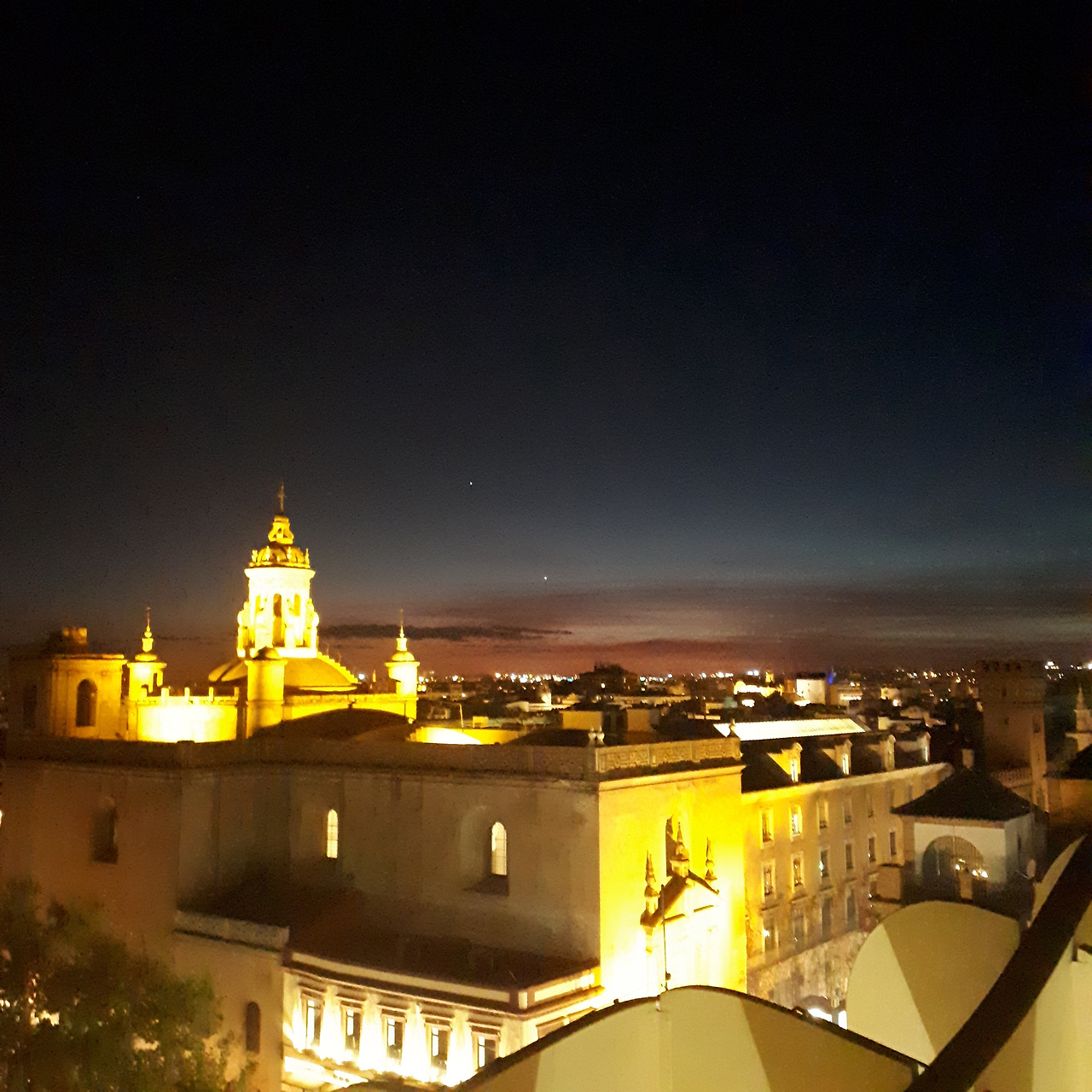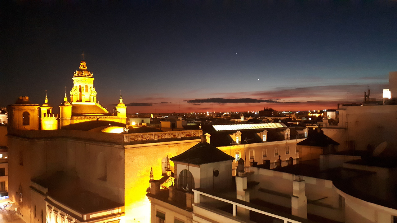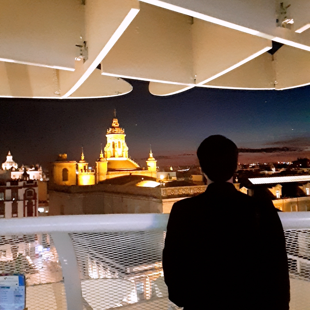 기나긴 입장권 줄을 구매한 뒤 파라솔에 올라가면 세비야의 전경이 보인다. 내가 올라갔을 땐 마침 해가 지는 시점이어서 세비야의 분홍빛 하늘을 잠시나마 볼 수 있었다. 검푸른 하늘 밑으로 분홍빛 노을이 얇게 펼쳐진다. 세비야의 건물들에 반사된 노을빛은 건물의 조명들과 함께 반짝이는 광경을 보여준다.
