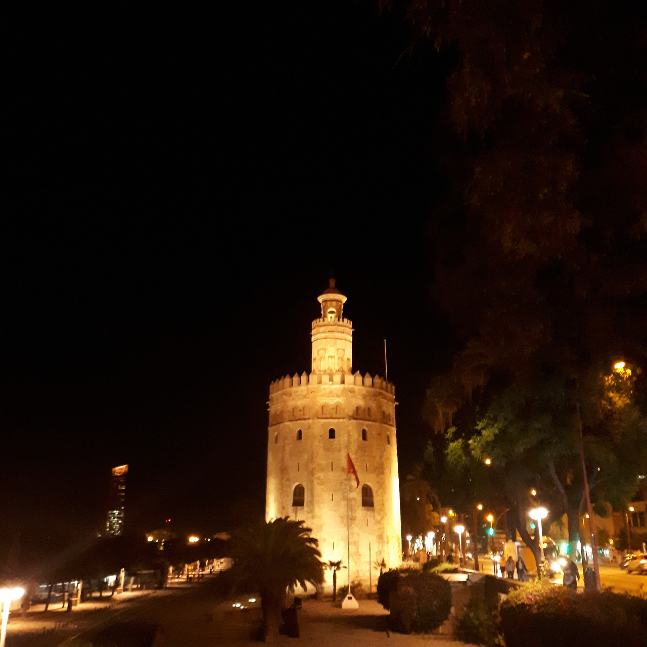 해가 지고는 세비야의 밤이 찾아온다. 보라빛 달빛 아래로 도시의 조명들이 별빛처럼 반짝인다. 한때 아메리카로부터 들어오는 황금이 넘처나던 도시답게, 도시의 조명도 황금빛이다. 조명이 켜지면 세비야의 밤은 황금의 도시로 비로소 변모했다. 황금빛 도시의 밤거리를 누비려 메트로폴 파라솔에서 내려와 황금의 탑으로 향했다. 황금빛 조명을 비추고 있는 황금의 탑 옆에는 세비야를 가로지르는 강이 흐르고 있다. 강물에 비춘 황금빛 도시의 광경이 빛나고 있었다.