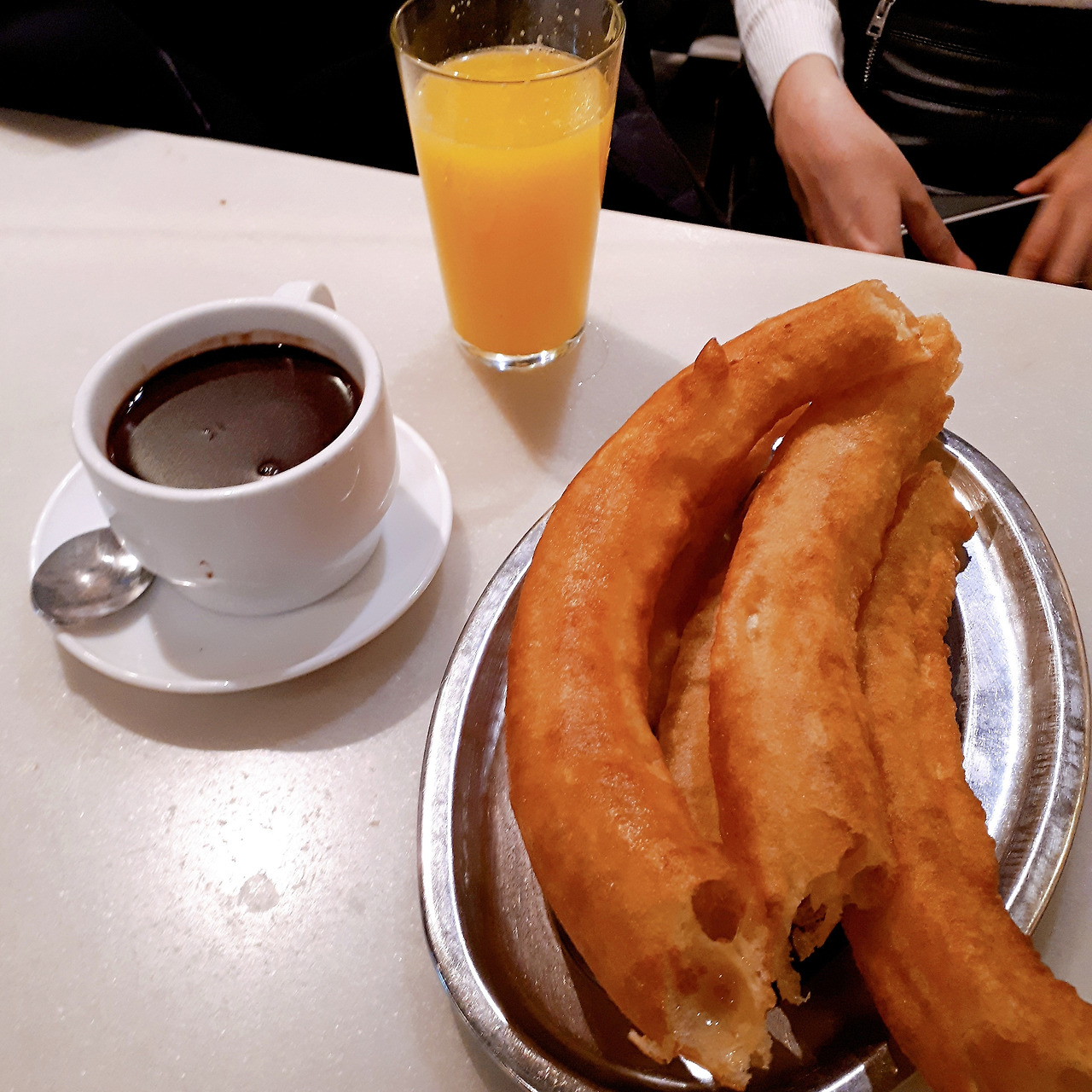 내가 발을 딛고 있는 도시가 황금의 도시란 사실을 자명하게 알려준 세비야 대성당과 히랄다 탑에서 벗어나 동행을 만나기로 했다. 오늘 만난 동행은 영국 런던의 회사에서 근무하는 직장인 여성분이었다. 히랄다 탑을 올라가느라 뱃속은 출출했기에 본격적인 저녁 이전에 간단히 요기를 하러 츄러스집에 들렀다. 스페인은 츄러스의 나라, 두꺼운 빵에 계피향이 솔솔 나는 츄러스를 진한 초콜릿에 찍어먹는다.
