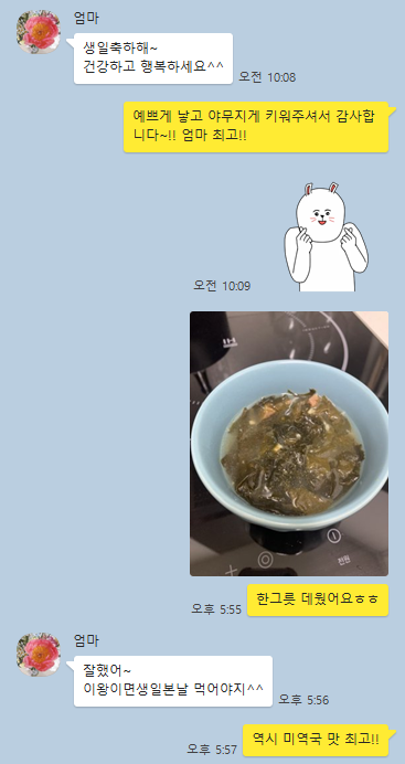 엄마의 ‘잘했어’라는 칭찬이 날 기쁘게 한다. 기왕이면 더 자주 듣고 싶다. 미역국 먹기를 참 잘했다!