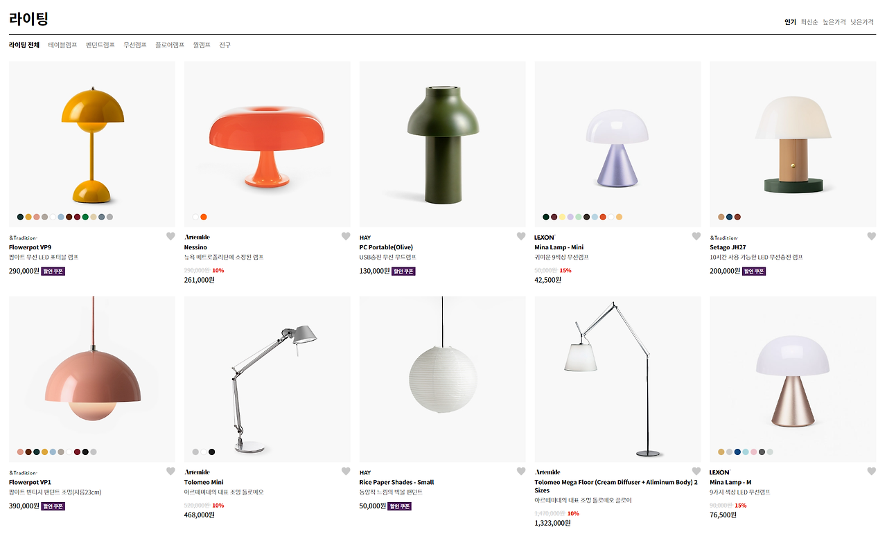 조명을 브랜드로 살펴보면 아르떼미데, 앤 트레디션, 해이, 오프라인 숍에는 루이스폴센, 베르판 같은 조명들의 유명한 디자인들을 확인해 볼 수 있다.