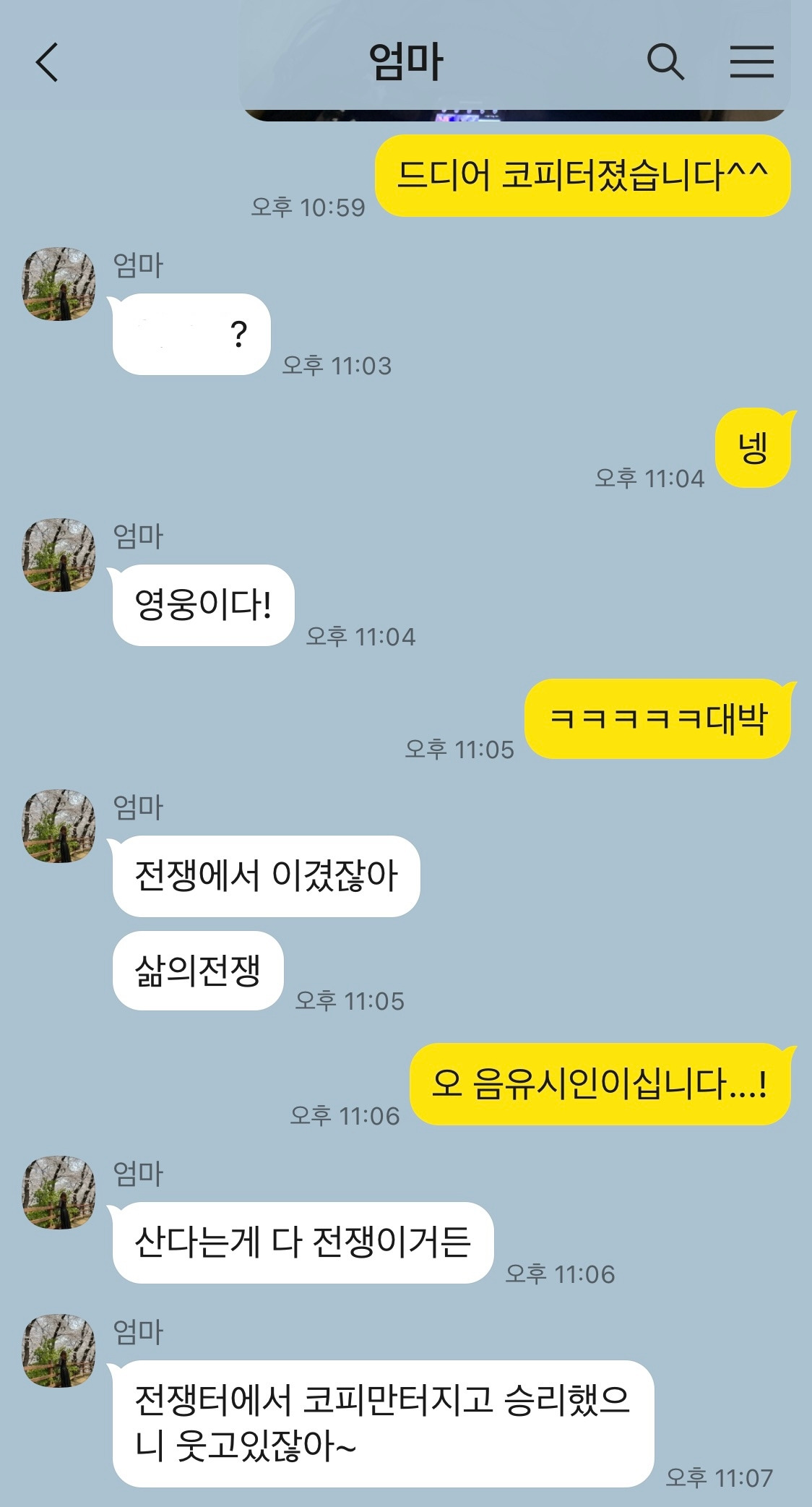 엄마는 코피가 터진 채 웃고 있는 동생의 사진을 보며 '삶의 전쟁에서 이긴 영웅'이라고 말해주었다. 산다는 게 전쟁인데, 전쟁터에서 승리했으니 코피만 터지고 웃고 있다면서. 동생한테 "야 엄마가 너 영웅이래"라고 말하니 "역시 엄마"라고 답을 하고 코피를 쓱 닦으면서 일어났다. 별일 아니라는 듯.