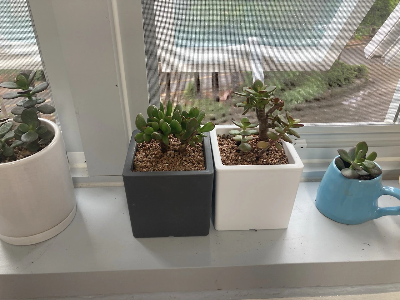 위 사진에서 흰 네모 화분이 내가 당시 이발하듯이잘라버린 다육이. 그렇게 잘리고 산삼 모양으로 휑덩그렁하게 있다가 몇개월만에 다시 저리 원상복귀됐다. 맨 왼쪽 원모양 화분이 그 잘라버린 네 가지에서 자란 다육이들이다.