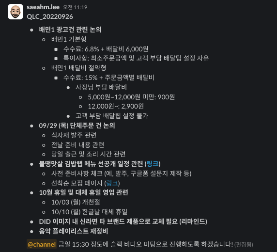그렇다고 '해보고 안되면 말고'는 절대 아니었다. 아니었던 이유에 대해서는 더 구체적이고 명확해지기 위해 노력했고, 추가 개선점을 찾아 시도해 보기도 하고 같은 상황에서 같은 실수를 반복하지 않기 위해 복기하기도 했다. 2호점인 영등포구청점을 창업한지 얼마 되지 않았을 때는 물리적으로 떨어져 있기도 하고 운영을 하다 보니 시간과 에너지가 부족해서인지 소통이 원활하지 못했다. 그러던 중 상시 소통하지만 조금 더 공식적으로 논의하고 결정하는 시간이 있으면 좋겠다는 의견을 토대로 일주일에 한 번씩 자칭 'QLC(Quick Lunch Chat)'를 진행하기 시작했다.