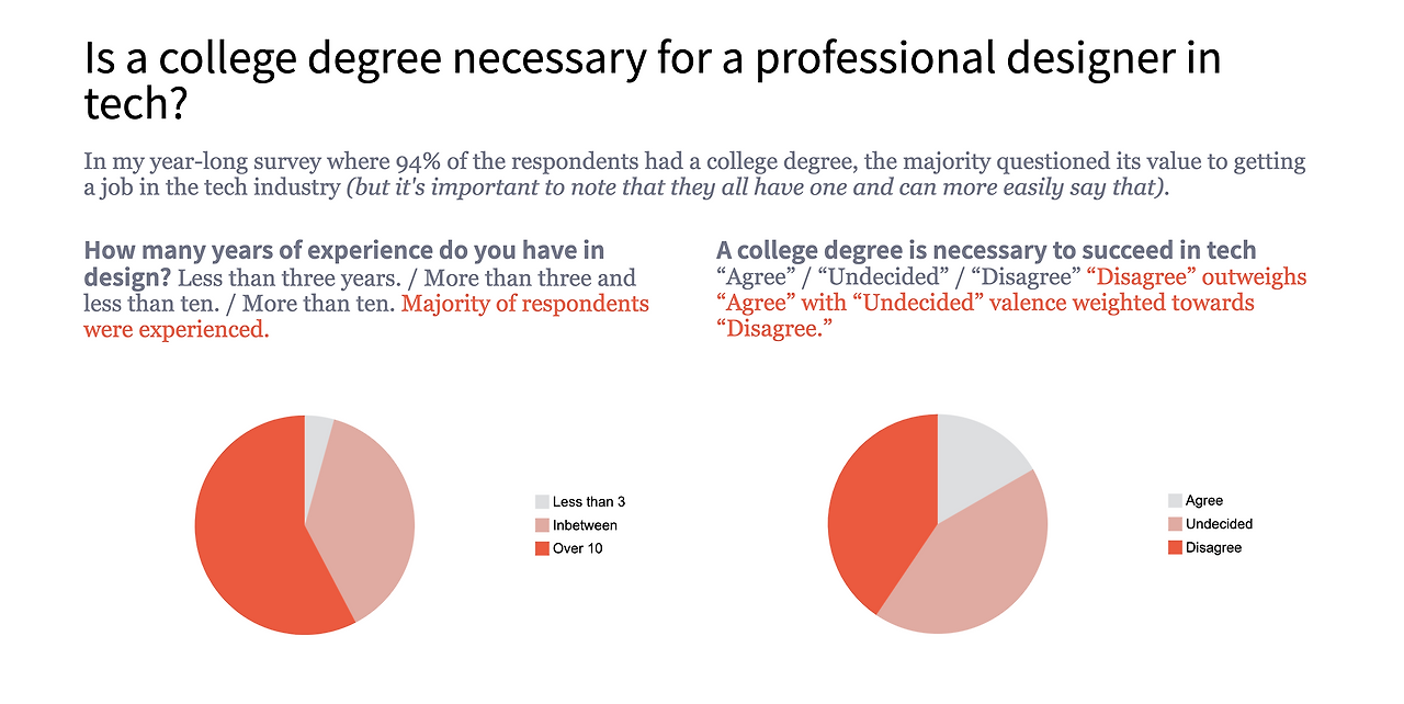 요즘 미국에서는 개발 부트캠프처럼 General Assembly 같은 디자인 부트캠프가 흥하고 있다. 관련 학과를 졸업하지 않더라도 바로 적용할 수 있는 실무 기술을 단기간에 배우면 디자인 업무를 수행할 수 있다는 걸 보여준다. 존 마에다의 2019년 Design in Tech Report에서 2000명을 대상으로 조사한 결과 "테크 업계에서 전문 디자이너로 일하려면 학위가 필수라고 생각하는가?"라는 "질문에 그렇지 않다"라고 대답한 사람이 "그렇다"라고 대답한 사람보다 훨씬 많았다.
