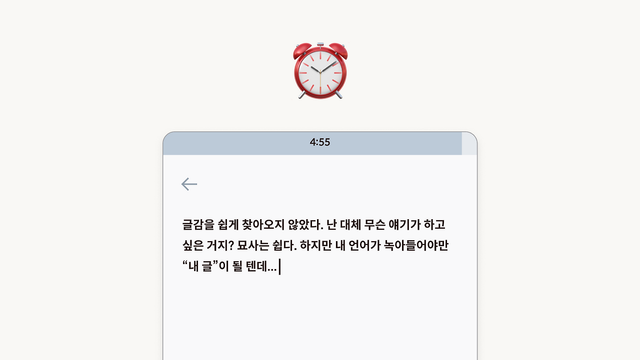 안드레스: 이번에 론칭한 첫 번째 실험은 5분 유산소 글쓰기입니다. 이 실험은 사용자가 글을 쓰는데 딱 5분만 줘요. 5분이 지나면 글이 자동으로 제출되고 다른 사용자가 읽을 수 있게 되죠.