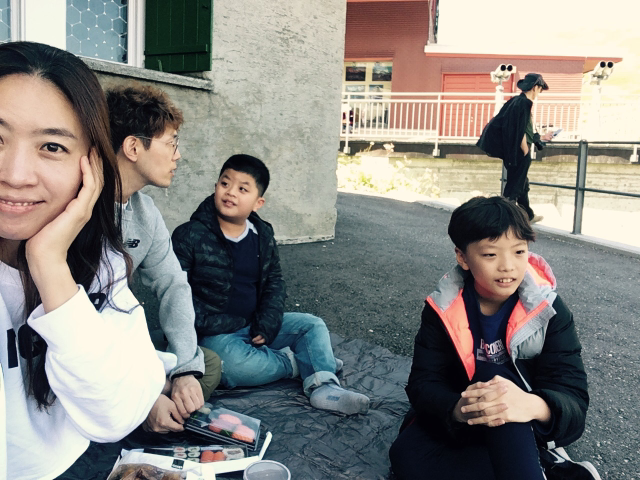 소중히 싸들고 알프스 봉우리가 내려다 보이는 어느 건물 뒤의 그늘에 자리를 잡았다. 추울까 싶어 가져간 이불은 돗자리로 변신했고 우리의 점심식사는 시작되었다.